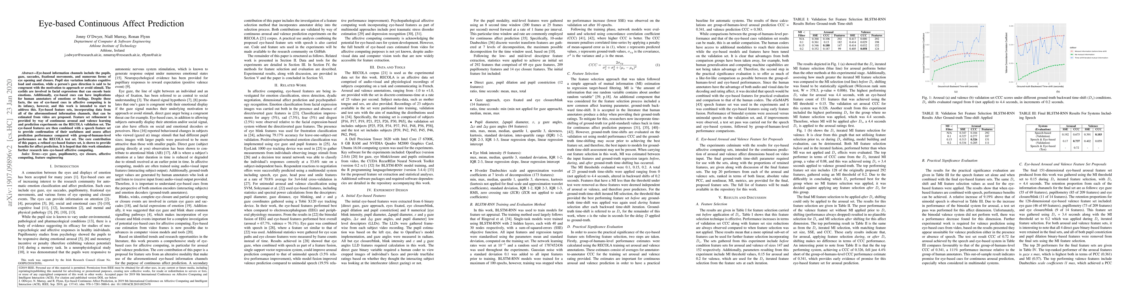 This paper proposes a refined eye-based feature set incorporating various eye cues for continuous affect prediction, demonstrating its effectiveness through experiments on the RECOLA dataset. Combined with speech features, these eye-based cues show promise in enhancing affective computing performance.