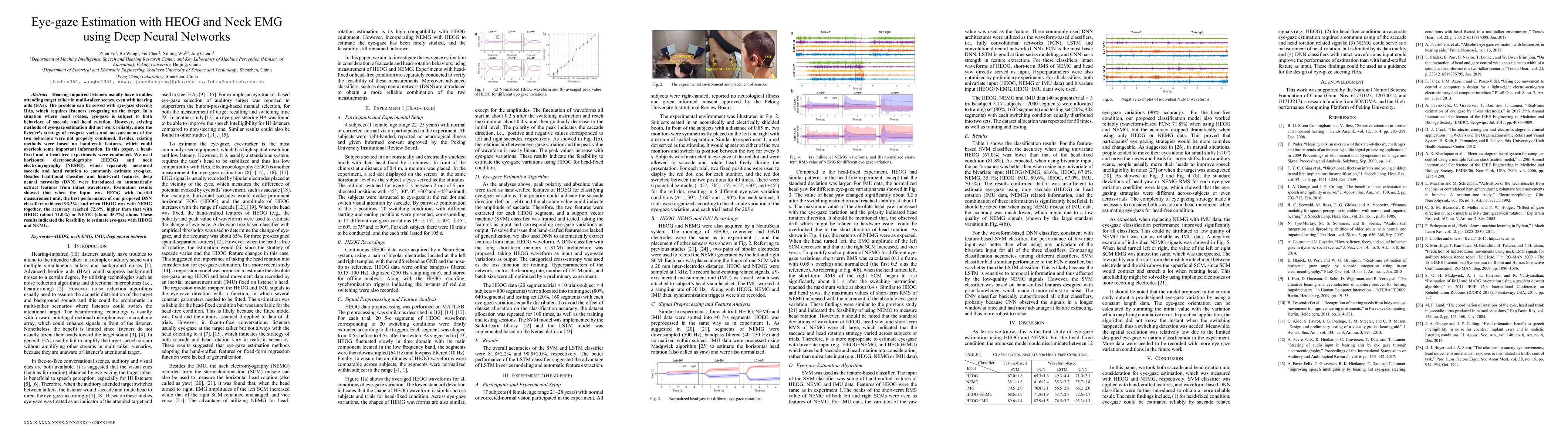 Researchers developed a new method to estimate eye-gaze in hearing-impaired listeners using horizontal electrooculography (HEOG) and neck electromyography (NEMG). Their deep neural network approach achieved high accuracy rates, outperforming existing methods.