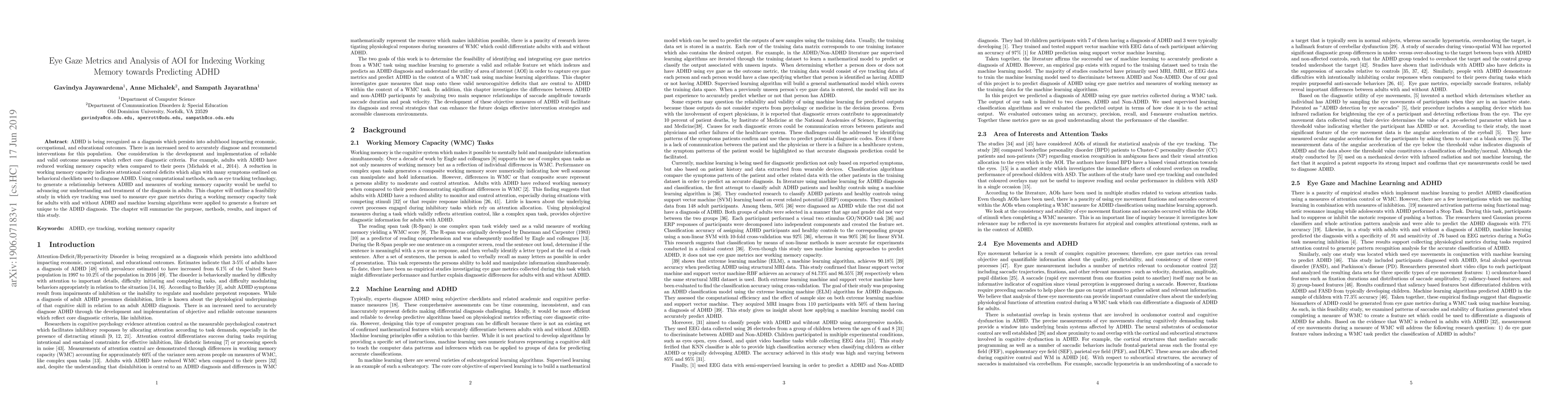 ADHD is being recognized as a diagnosis which persists into adulthood impacting economic, occupational, and educational outcomes. There is an increased need to accurately diagnose and recommend interventions for this population. One consideration is the development and implementation of reliable and valid outcome measures which reflect core diagnostic criteria. For example, adults with ADHD have reduced working memory capacity when compared to their peers (Michalek et al., 2014). A reduction in working memory capacity indicates attentional control deficits which align with many symptoms outlined on behavioral checklists used to diagnose ADHD. Using computational methods, such as eye tracking technology, to generate a relationship between ADHD and measures of working memory capacity would be useful to advancing our understanding and treatment of the diagnosis in adults. This chapter will outline a feasibility study in which eye tracking was used to measure eye gaze metrics during a working memory capacity task for adults with and without ADHD and machine learning algorithms were applied to generate a feature set unique to the ADHD diagnosis. The chapter will summarize the purpose, methods, results, and impact of this study.