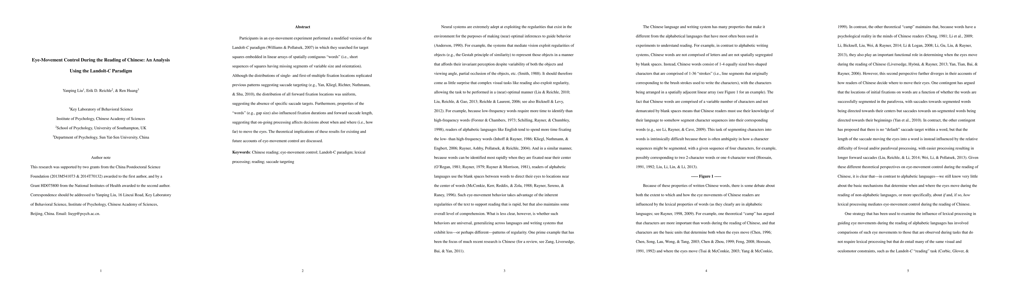 This study examines eye movements while reading Chinese characters represented as 'words' (sequences of squares with missing parts). Using a modified Landolt-C paradigm, it finds that while single-fixation and initial fixation locations follow typical patterns, all forward fixation locations are uniformly distributed, indicating no specific saccade targets. Fixation duration and saccade length are also influenced by 'word' properties, suggesting ongoing processing impacts eye movement decisions.