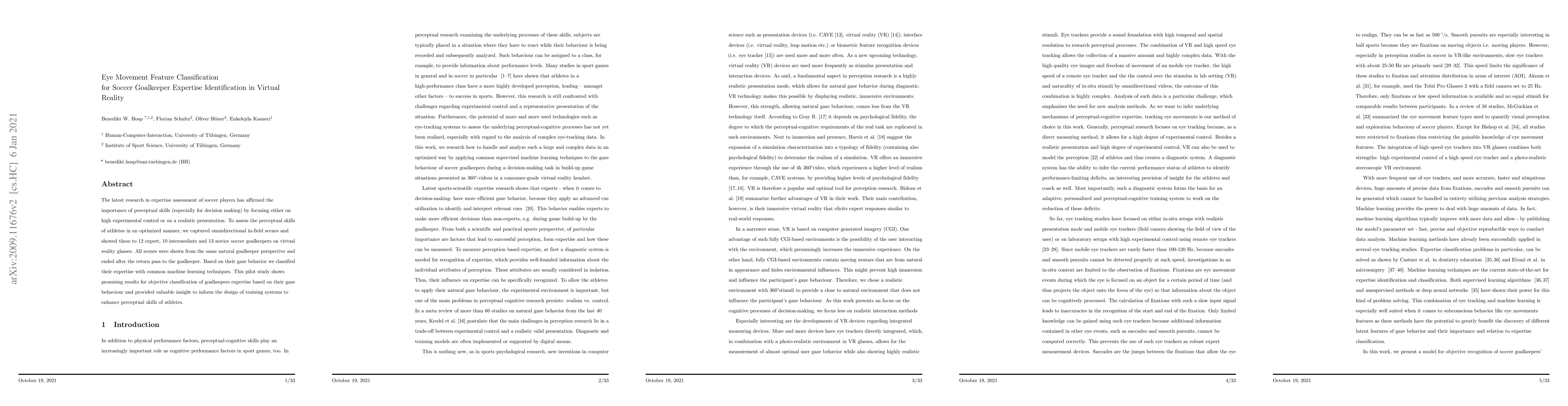 This study uses VR to analyze soccer goalkeepers' eye movements, categorizing 12 experts, 10 intermediates, and 13 novices. Results suggest successful classification of expertise based on gaze behavior, indicating potential for VR-based training systems to improve athletes' perceptual skills.