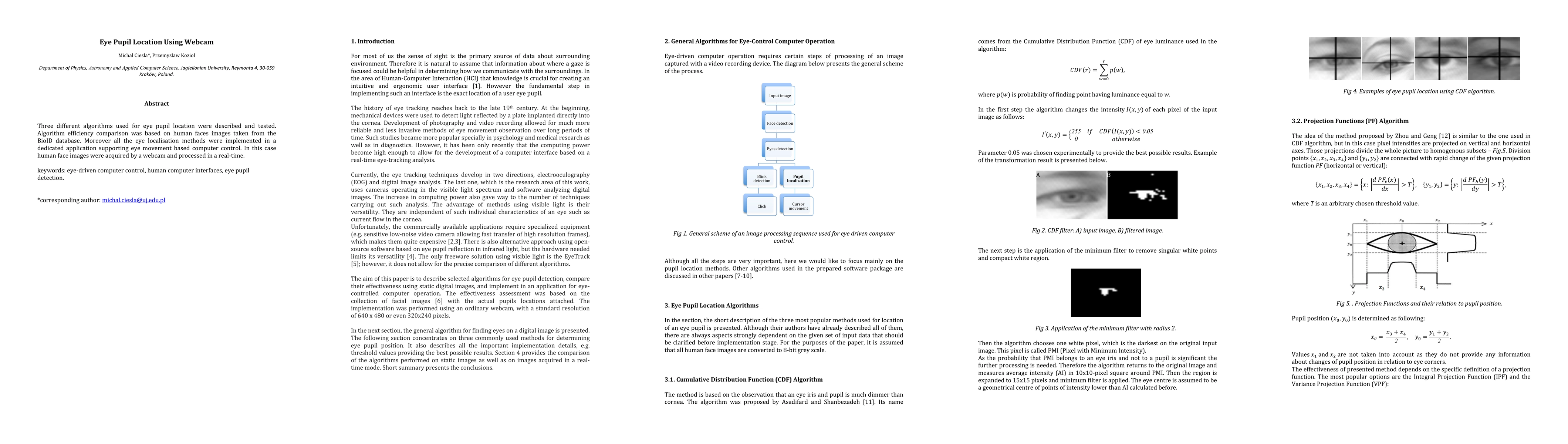 This paper compares the efficiency of three algorithms for locating eye pupils in human faces using webcam images, testing them on the BioID database and implementing them in a real-time application for eye movement-based computer control. The results provide insights into the best method for real-time pupil localization.