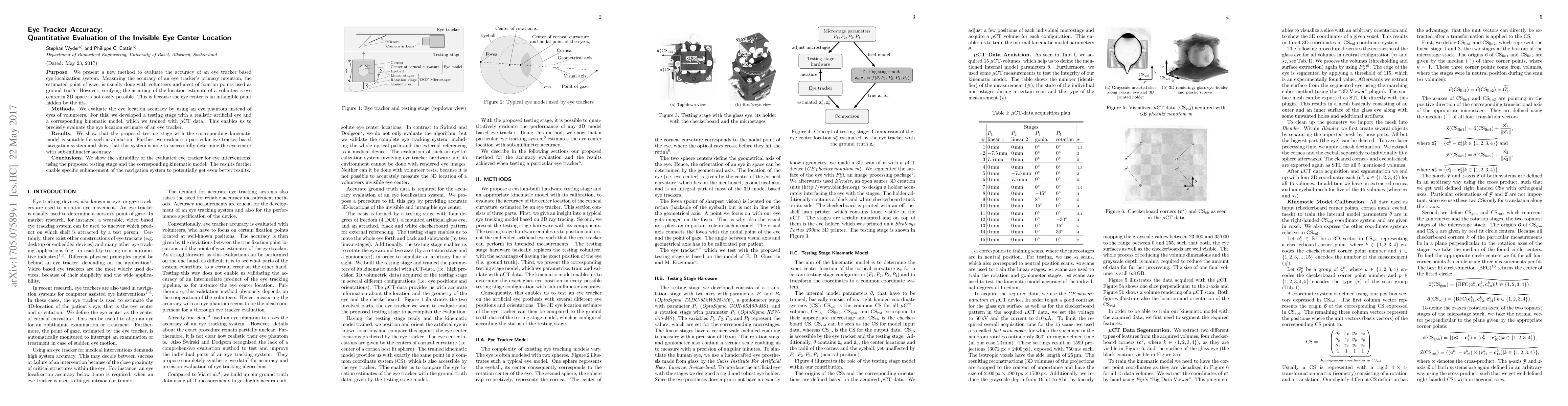 Purpose. We present a new method to evaluate the accuracy of an eye tracker based eye localization system. Measuring the accuracy of an eye tracker's primary intention, the estimated point of gaze, is usually done with volunteers and a set of fixation points used as ground truth. However, verifying the accuracy of the location estimate of a volunteer's eye center in 3D space is not easily possible. This is because the eye center is an intangible point hidden by the iris. Methods. We evaluate the eye location accuracy by using an eye phantom instead of eyes of volunteers. For this, we developed a testing stage with a realistic artificial eye and a corresponding kinematic model, which we trained with {\mu}CT data. This enables us to precisely evaluate the eye location estimate of an eye tracker. Results. We show that the proposed testing stage with the corresponding kinematic model is suitable for such a validation. Further, we evaluate a particular eye tracker based navigation system and show that this system is able to successfully determine the eye center with sub-millimeter accuracy. Conclusions. We show the suitability of the evaluated eye tracker for eye interventions, using the proposed testing stage and the corresponding kinematic model. The results further enable specific enhancement of the navigation system to potentially get even better results.