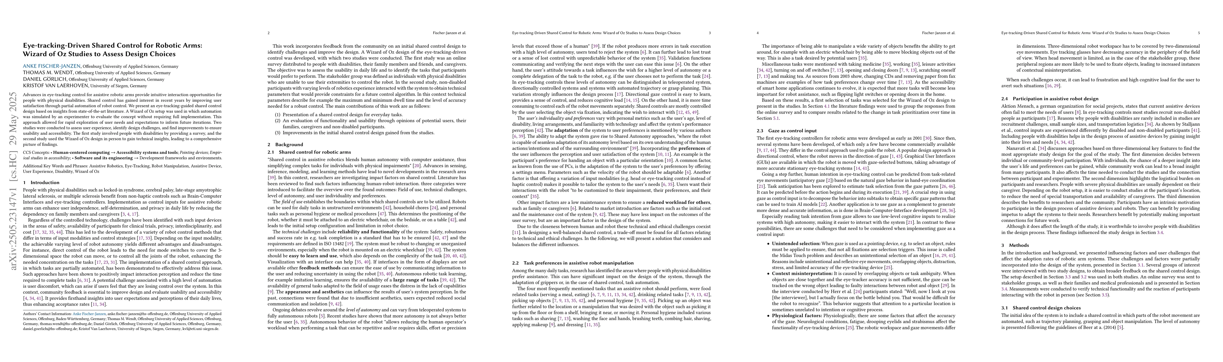 The research employed a Wizard of Oz approach, combining an online survey with people with disabilities, their families, and caregivers, and a hands-on study involving participants with and without prior experience with robotic arms to assess the usability and technical requirements of an eye-tracking-driven shared control design for assistive robotic arms.