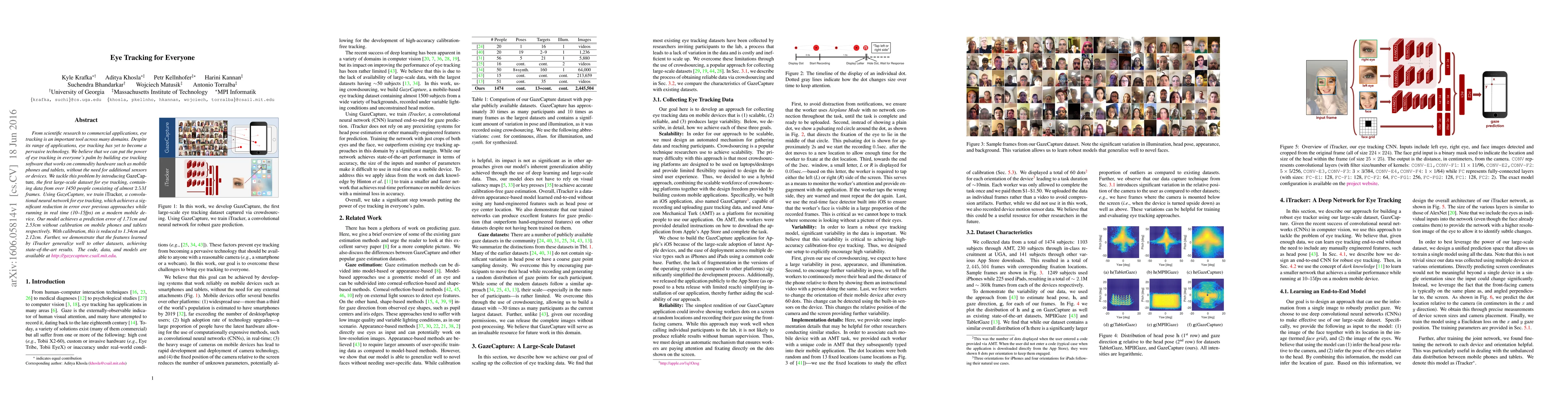 This paper introduces GazeCapture, a large-scale dataset for eye tracking, and iTracker, a convolutional neural network that enables accurate eye tracking on commodity hardware like mobile phones and tablets. The model achieves high accuracy and real-time performance, generalizing well across datasets.