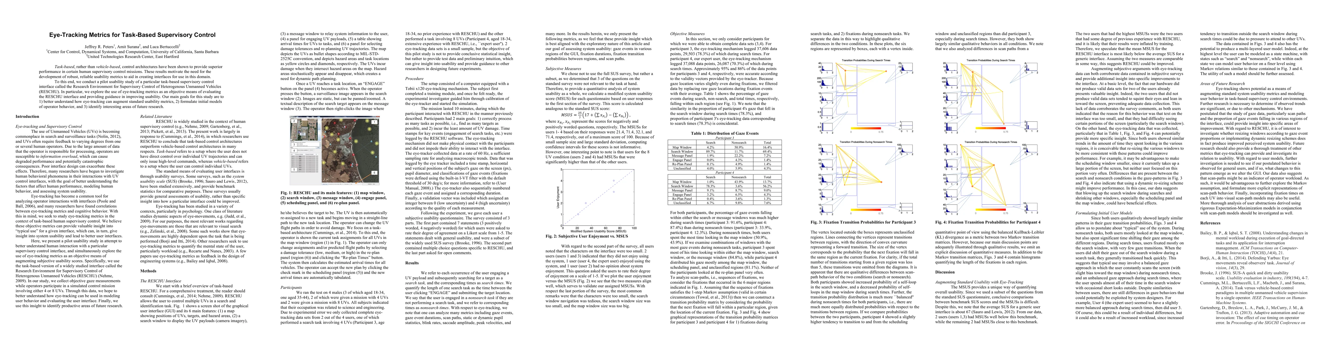 Task-based, rather than vehicle-based, control architectures have been shown to provide superior performance in certain human supervisory control missions. These results motivate the need for the development of robust, reliable usability metrics to aid in creating interfaces for use in this domain. To this end, we conduct a pilot usability study of a particular task-based supervisory control interface called the Research Environment for Supervisory Control of Heterogenous Unmanned Vehicles (RESCHU). In particular, we explore the use of eye-tracking metrics as an objective means of evaluating the RESCHU interface and providing guidance in improving usability. Our main goals for this study are to 1) better understand how eye-tracking can augment standard usability metrics, 2) formulate initial models of operator behavior, and 3) identify interesting areas of future research.