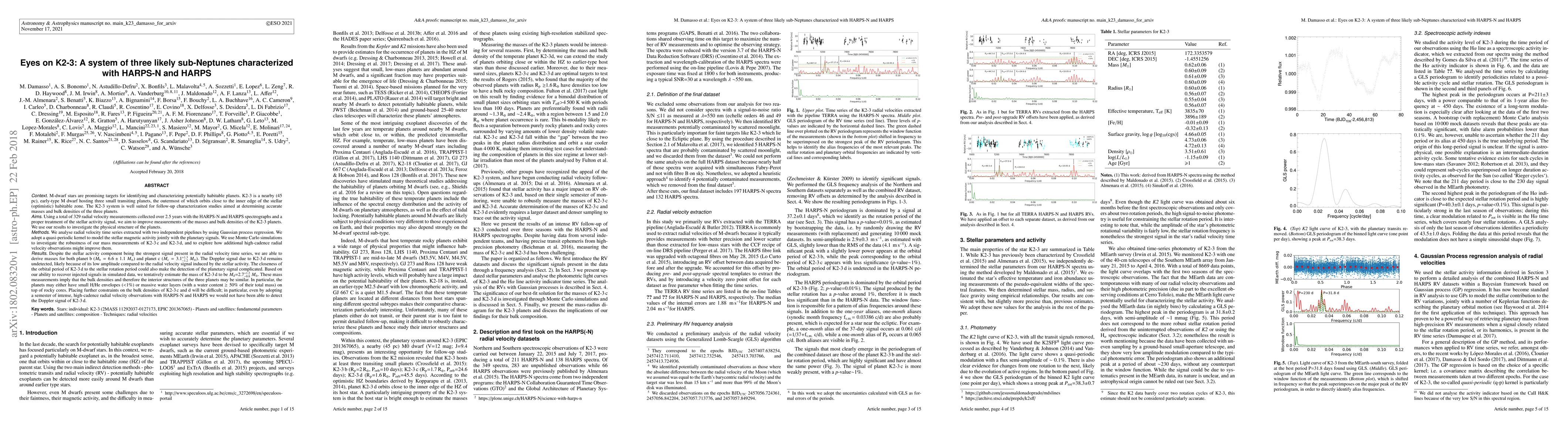 This paper characterizes three small transiting planets orbiting the nearby M-dwarf star K2-3 using radial velocity measurements from HARPS-N and HARPS spectrographs. The study successfully determines the masses of planets b and c, while the Doppler signal for planet d remains undetected due to its low amplitude and proximity to the stellar rotation period.