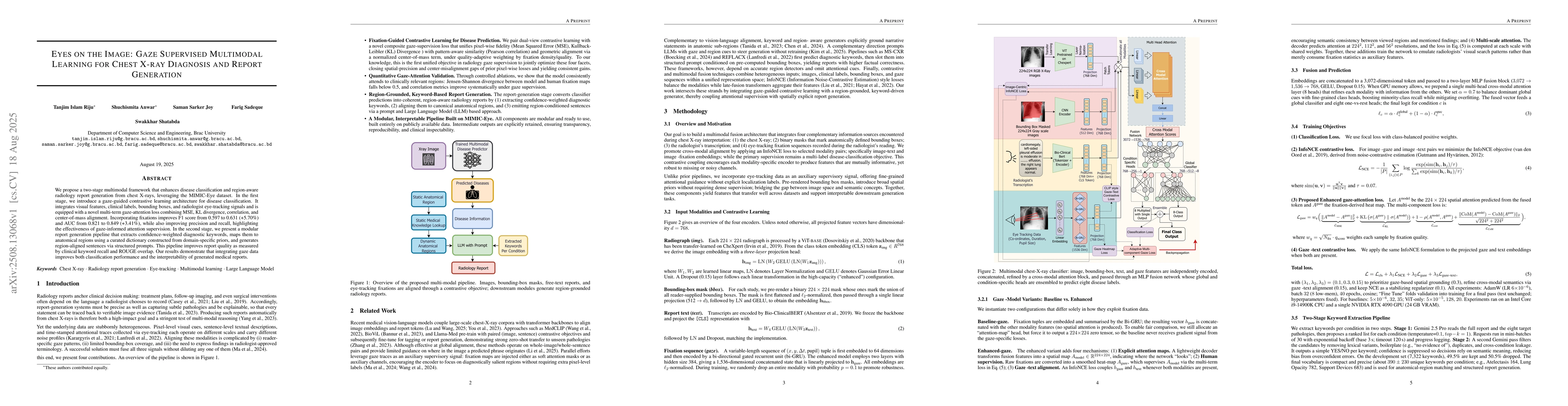 We propose a two-stage multimodal framework that enhances disease classification and region-aware radiology report generation from chest X-rays, leveraging the MIMIC-Eye dataset. In the first stage, we introduce a gaze-guided contrastive learning architecture for disease classification. It integrates visual features, clinical labels, bounding boxes, and radiologist eye-tracking signals and is equipped with a novel multi-term gaze-attention loss combining MSE, KL divergence, correlation, and center-of-mass alignment. Incorporating fixations improves F1 score from 0.597 to 0.631 (+5.70%) and AUC from 0.821 to 0.849 (+3.41%), while also improving precision and recall, highlighting the effectiveness of gaze-informed attention supervision. In the second stage, we present a modular report generation pipeline that extracts confidence-weighted diagnostic keywords, maps them to anatomical regions using a curated dictionary constructed from domain-specific priors, and generates region-aligned sentences via structured prompts. This pipeline improves report quality as measured by clinical keyword recall and ROUGE overlap. Our results demonstrate that integrating gaze data improves both classification performance and the interpretability of generated medical reports.