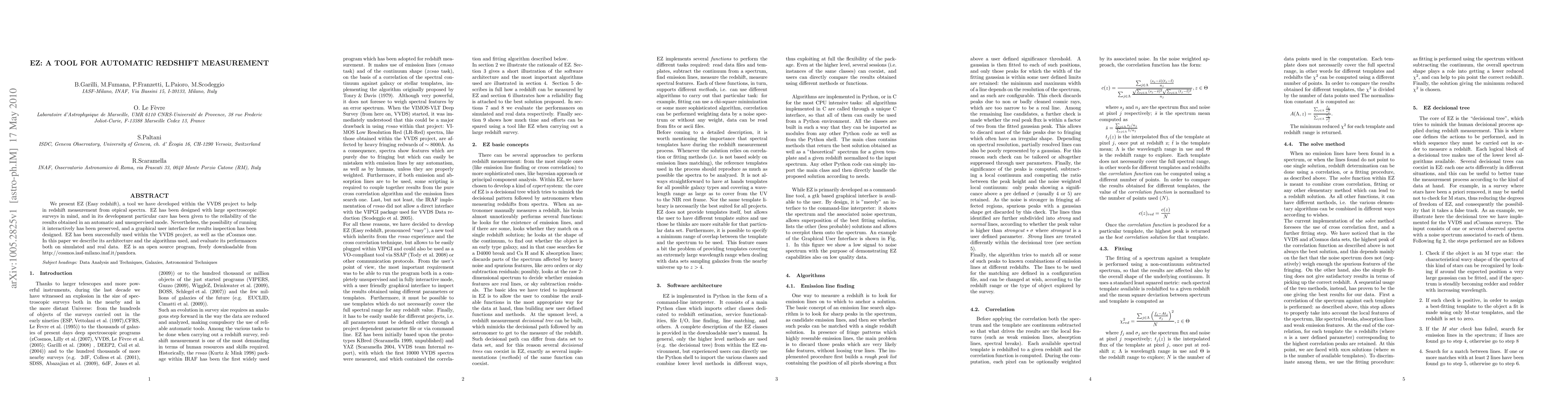 We present EZ (Easy redshift), a tool we have developed within the VVDS project to help in redshift measurement from otpical spectra. EZ has been designed with large spectroscopic surveys in mind, and in its development particular care has been given to the reliability of the results obtained in an automatic and unsupervised mode. Nevertheless, the possibility of running it interactively has been preserved, and a graphical user interface for results inspection has been designed. EZ has been successfully used within the VVDS project, as well as the zCosmos one. In this paper we describe its architecture and the algorithms used, and evaluate its performances both on simulated and real data. EZ is an open source program, freely downloadable from http://cosmos.iasf-milano.inaf.it/pandora.