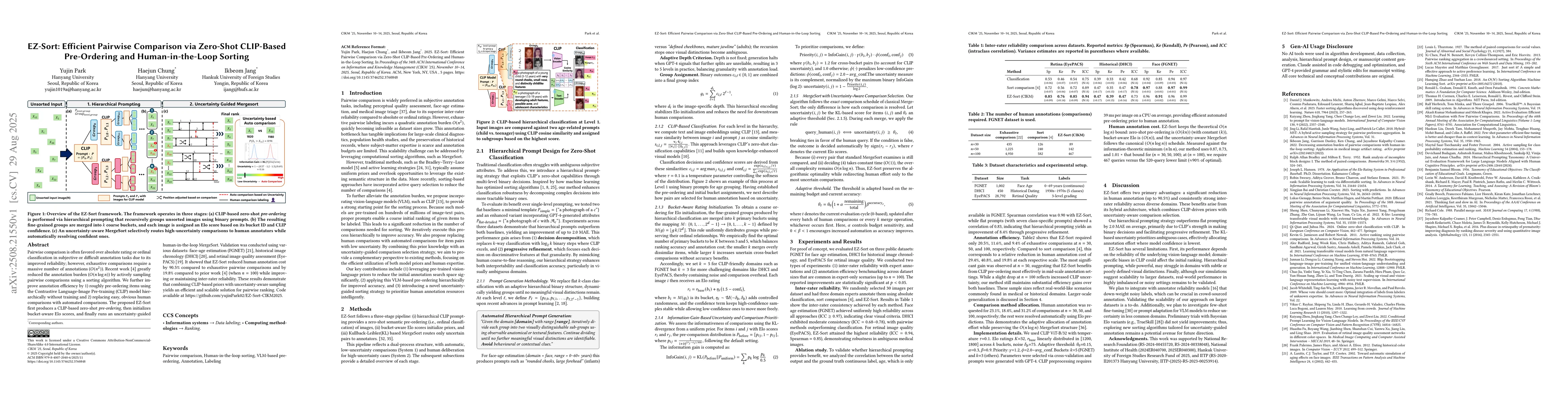 Pairwise comparison is often favored over absolute rating or ordinal classification in subjective or difficult annotation tasks due to its improved reliability. However, exhaustive comparisons require a massive number of annotations (O(n^2)). Recent work has greatly reduced the annotation burden (O(n log n)) by actively sampling pairwise comparisons using a sorting algorithm. We further improve annotation efficiency by (1) roughly pre-ordering items using the Contrastive Language-Image Pre-training (CLIP) model hierarchically without training, and (2) replacing easy, obvious human comparisons with automated comparisons. The proposed EZ-Sort first produces a CLIP-based zero-shot pre-ordering, then initializes bucket-aware Elo scores, and finally runs an uncertainty-guided human-in-the-loop MergeSort. Validation was conducted using various datasets: face-age estimation (FGNET), historical image chronology (DHCI), and retinal image quality assessment (EyePACS). It showed that EZ-Sort reduced human annotation cost by 90.5% compared to exhaustive pairwise comparisons and by 19.8% compared to prior work (when n = 100), while improving or maintaining inter-rater reliability. These results demonstrate that combining CLIP-based priors with uncertainty-aware sampling yields an efficient and scalable solution for pairwise ranking.