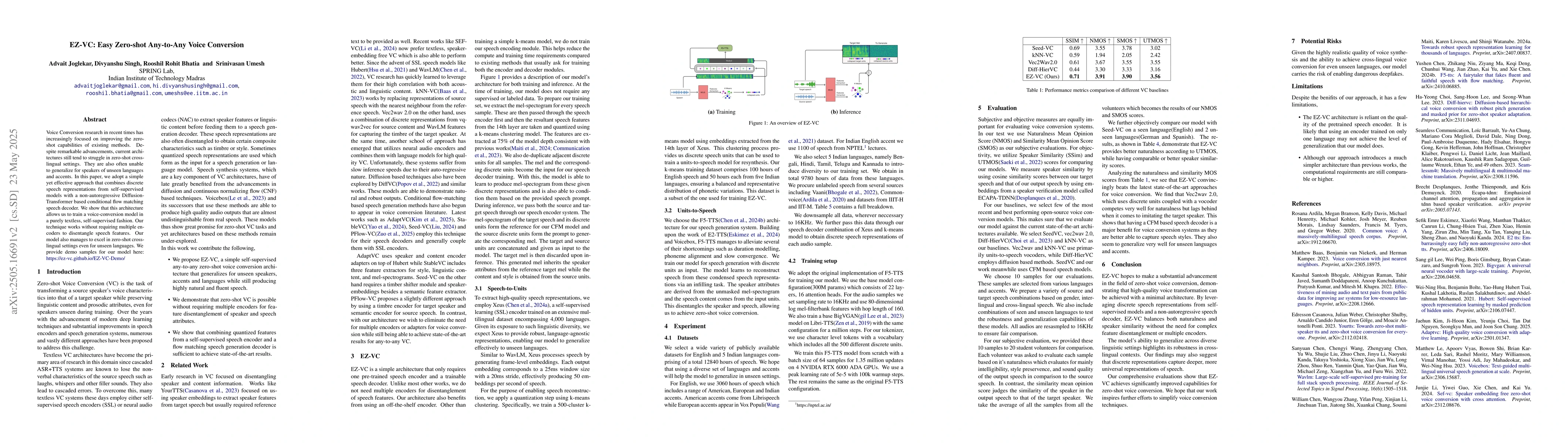 The paper proposes a voice conversion method, EZ-VC, that combines discrete speech representations from self-supervised models with a non-autoregressive Diffusion-Transformer based conditional flow matching speech decoder, enabling textless, self-supervised training without the need for multiple encoders to disentangle speech features.