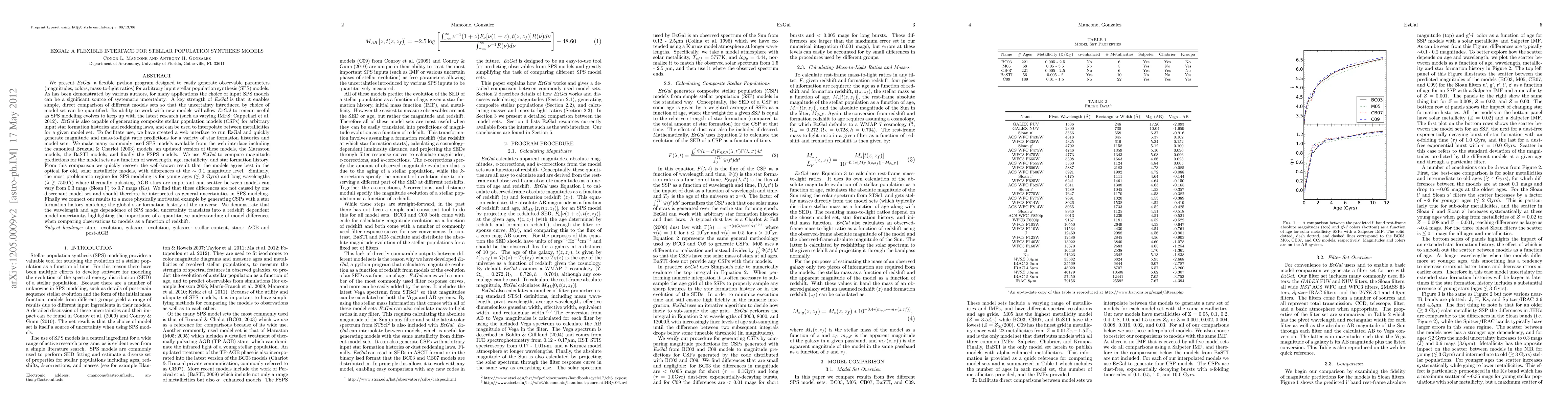 We present EzGal, a flexible python program designed to easily generate observable parameters (magnitudes, colors, mass-to-light ratios) for any stellar population synthesis (SPS) model. As has been demonstrated by various authors, the choice of input SPS models can be a significant source of systematic uncertainty. A key strength of EzGal is that it enables simple, direct comparison of different models sets. EzGal is also capable of generating composite stellar population models (CSPs) and can interpolate between metallicities for a given model set. We have created a web interface to run EzGal and generate observables for a variety of star formation histories and model sets. We make many commonly used SPS models available from this interface; the BC03 models, an updated version of these models, the Maraston models, the BaSTI models, and finally the FSPS models. We use EzGal to compare magnitude predictions for the model sets as a function of wavelength, age, metallicity, and star formation history. We recover the well-known result that the models agree best in the optical for old, solar metallicity models, with differences at the ~0.1 magnitude level. The most problematic regime for SPS modeling is for young ages (<2 Gyrs) and long wavelengths (lambda >7500 Angstroms) where scatter between models can vary from 0.3 mags (Sloan i) to 0.7 mags (Ks). We find that these differences are best understood as general uncertainties in SPS modeling. Finally we explore a more physically motivated example by generating CSPs with a star formation history matching the global star formation history of the universe. We demonstrate that the wavelength and age dependence of SPS model uncertainty translates into a redshift dependent model uncertainty, highlighting the importance of a quantitative understanding of model differences when comparing observations to models as a function of redshift.
