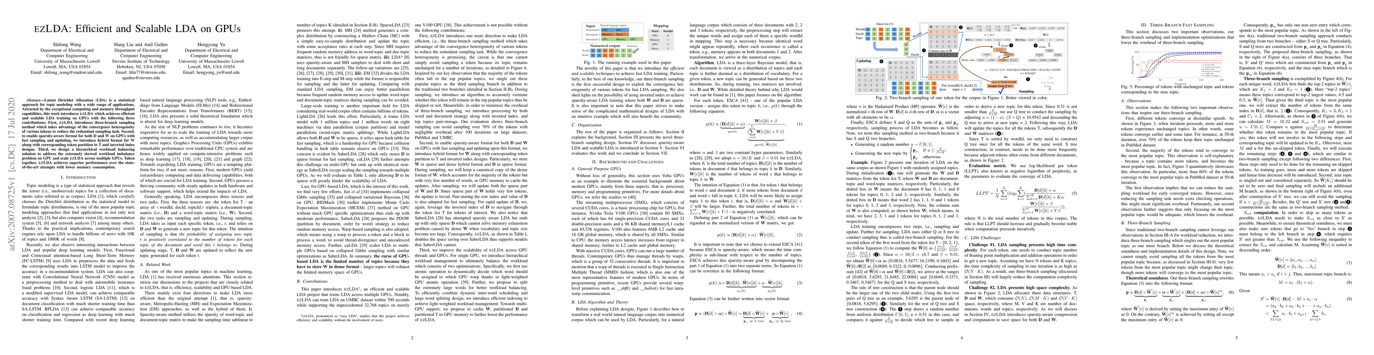 LDA is a statistical approach for topic modeling with a wide range of applications. However, there exist very few attempts to accelerate LDA on GPUs which come with exceptional computing and memory throughput capabilities. To this end, we introduce EZLDA which achieves efficient and scalable LDA training on GPUs with the following three contributions: First, EZLDA introduces three-branch sampling method which takes advantage of the convergence heterogeneity of various tokens to reduce the redundant sampling task. Second, to enable sparsity-aware format for both D and W on GPUs with fast sampling and updating, we introduce hybrid format for W along with corresponding token partition to T and inverted index designs. Third, we design a hierarchical workload balancing solution to address the extremely skewed workload imbalance problem on GPU and scaleEZLDA across multiple GPUs. Taken together, EZLDA achieves superior performance over the state-of-the-art attempts with lower memory consumption.