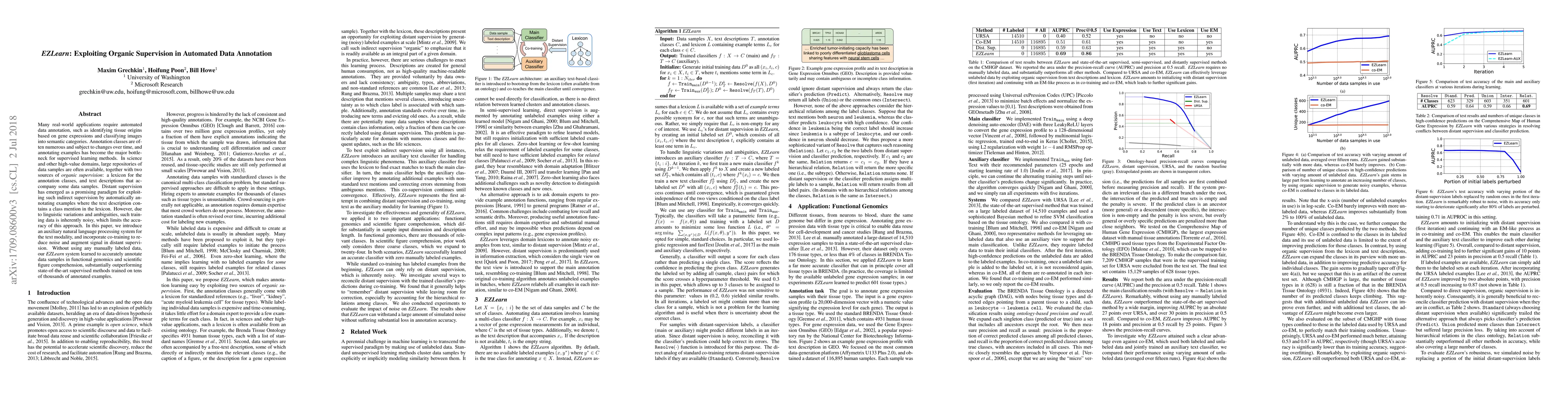 A new system called EZLearn uses natural language processing and co-training to accurately annotate large datasets without human labels, outperforming existing methods in functional genomics and scientific figure comprehension.