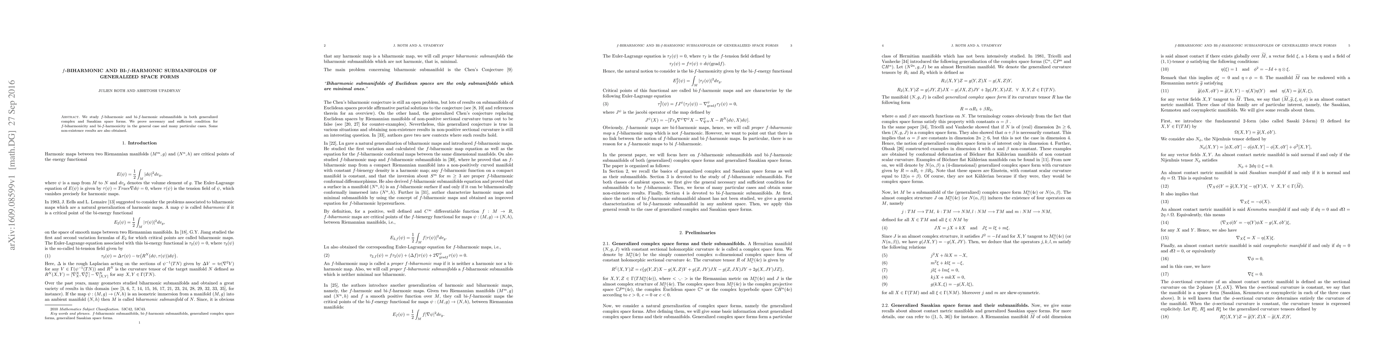 This paper investigates f-biharmonic and bi-f-harmonic submanifolds within generalized complex and Sasakian space forms, establishing necessary and sufficient conditions for these properties and presenting non-existence results.