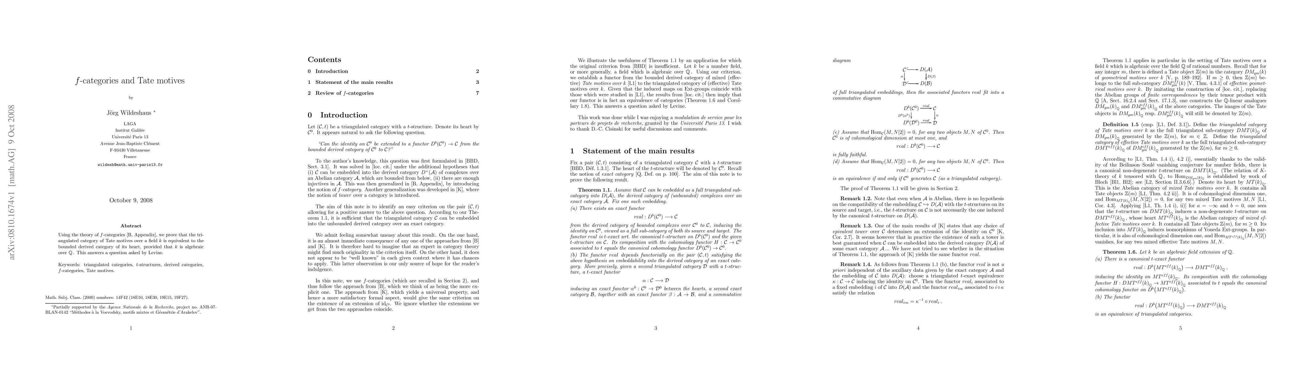Using Beilinson's theory of f-categories, we prove that the triangulated category of Tate motives over a field k is equivalent to the bounded derived category of its heart, provided that k is algebraic over the rationals. This answers a question asked by Levine.