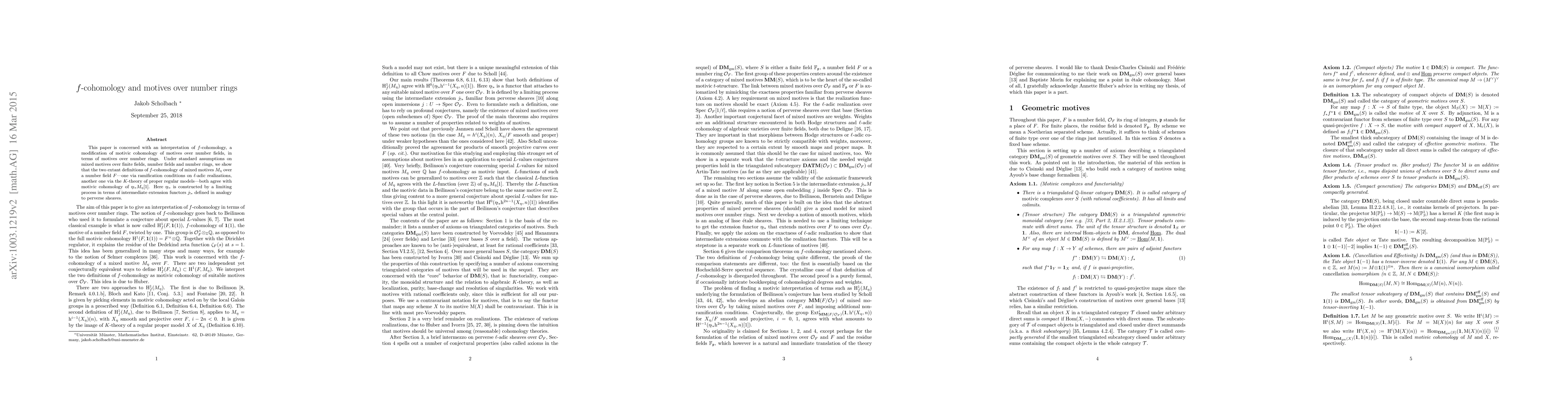 This paper explores f-cohomology, a variant of motivic cohomology for motives over number fields, and establishes its equivalence to motivic cohomology for motives over number rings. It demonstrates that two definitions of f-cohomology align under standard assumptions on mixed motives, utilizing techniques analogous to perverse sheaves.