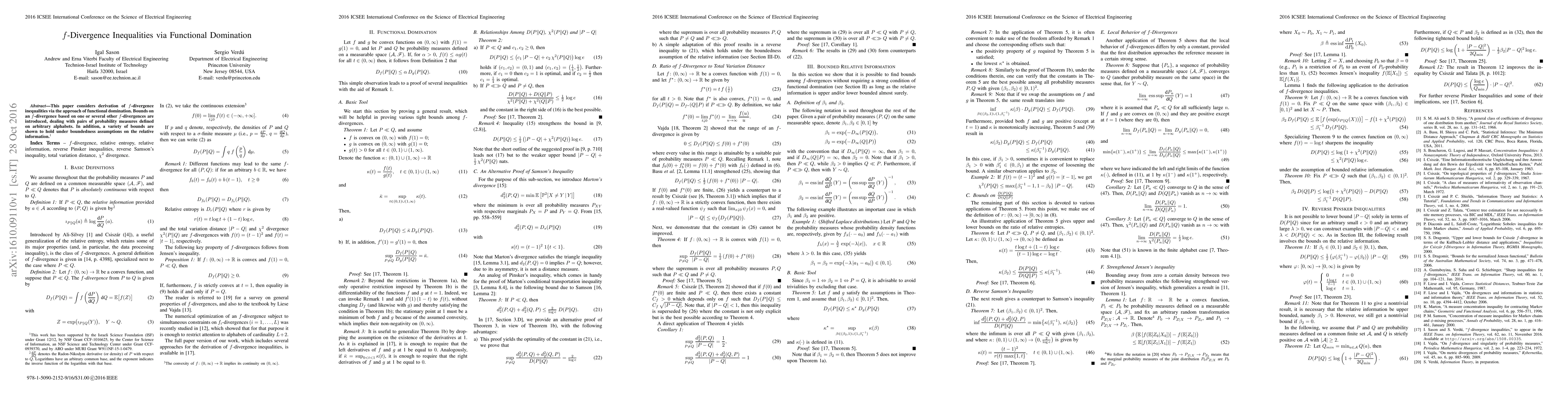 This paper derives $f$-divergence inequalities using functional domination, introducing bounds based on other $f$-divergences for probability measures on arbitrary alphabets, and demonstrating various bounds under boundedness assumptions on relative information. The full version with additional derivations and proofs is available on arXiv.