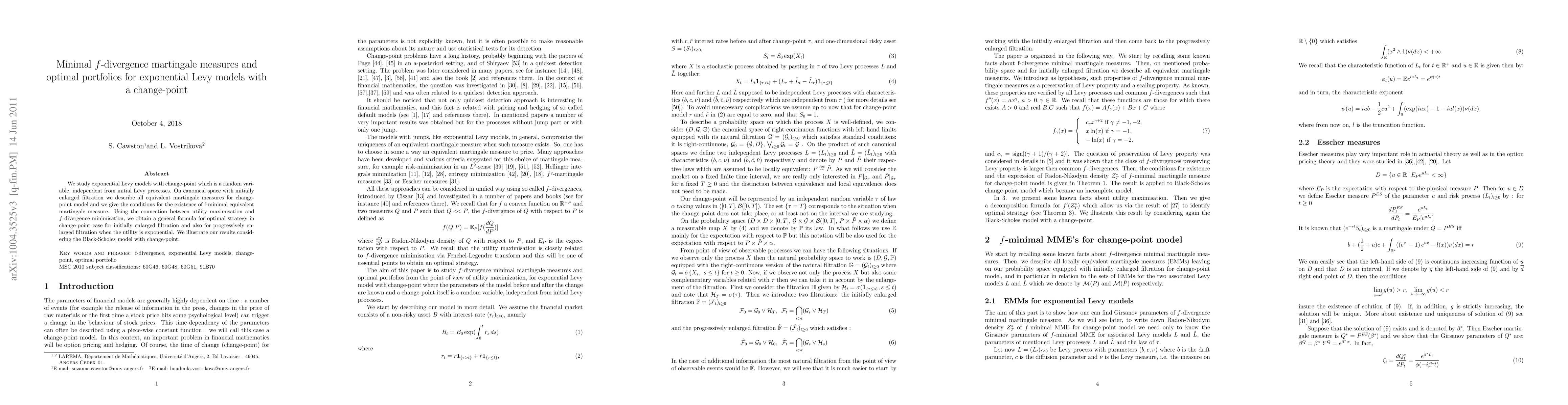 This paper explores exponential Lévy models with a random change-point, identifying conditions for the existence of $f$-divergence minimal equivalent martingale measures. It derives a general formula for optimal portfolio strategies under exponential utility, illustrated with the Black-Scholes model.