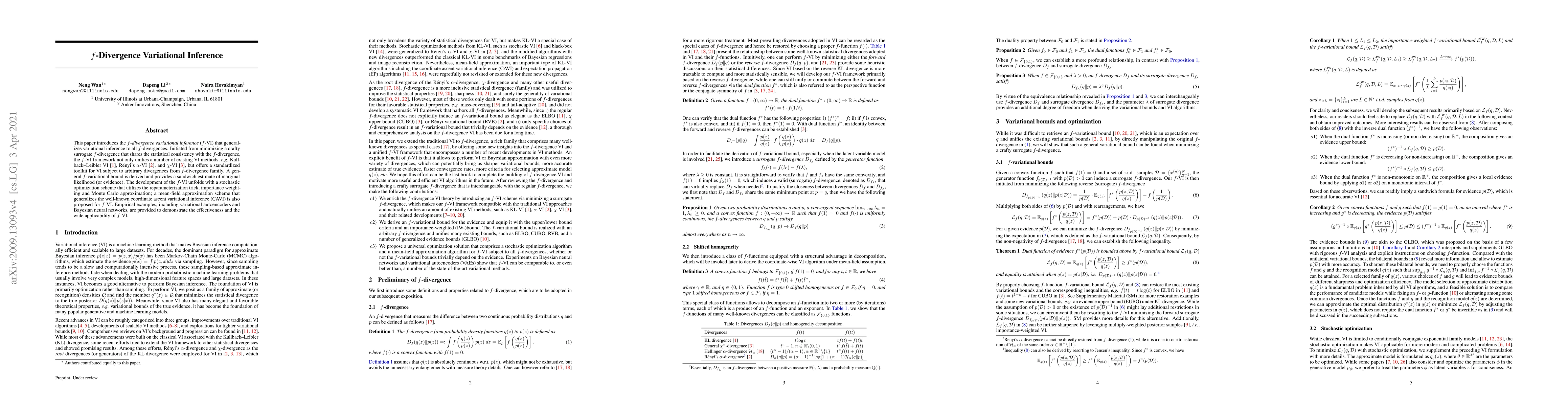 This paper proposes $f$-divergence variational inference ($f$-VI), a generalized framework that unifies various existing variational inference methods under a standardized toolkit for arbitrary divergences. It demonstrates the effectiveness through empirical examples in variational autoencoders and Bayesian neural networks.