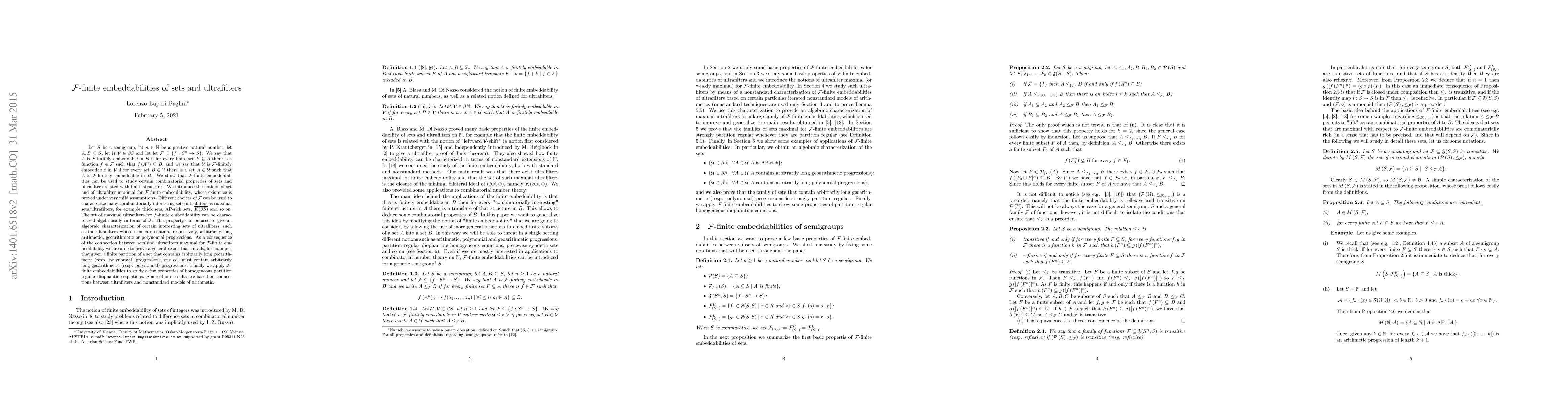 This paper explores the concept of $\mathcal{F}$-finite embeddabilities of sets and ultrafilters in semigroups, demonstrating their utility in studying combinatorial properties related to finite structures. It introduces maximal sets and ultrafilters for $\mathcal{F}$-finite embeddability, proving their existence under mild conditions and using them to characterize various interesting sets and ultrafilters.
