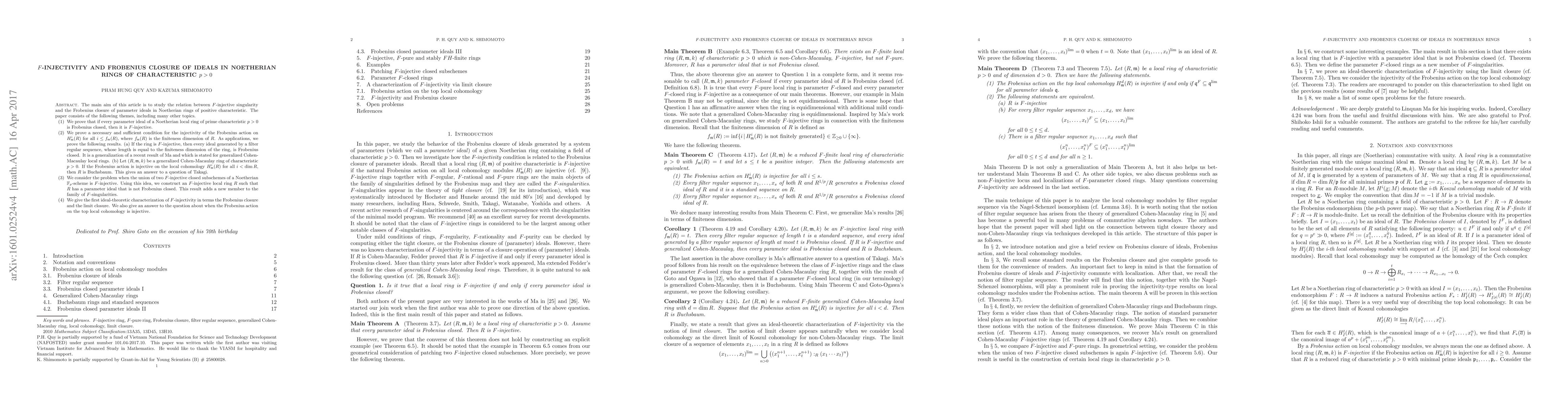 The main aim of this article is to study the relation between $F$-injective singularity and the Frobenius closure of parameter ideals in Noetherian rings of positive characteristic. The paper consists of the following themes, including many other topics. We prove that if every parameter ideal of a Noetherian local ring of prime characteristic $p>0$ is Frobenius closed, then it is $F$-injective. We prove a necessary and sufficient condition for the injectivity of the Frobenius action on $H^i_{\fm}(R)$ for all $i \le f_{\fm}(R)$, where $f_{\fm}(R)$ is the finiteness dimension of $R$. As applications, we prove the following results. (a) If the ring is $F$-injective, then every ideal generated by a filter regular sequence, whose length is equal to the finiteness dimension of the ring, is Frobenius closed. It is a generalization of a recent result of Ma and which is stated for generalized Cohen-Macaulay local rings. (b) Let $(R,\fm,k)$ be a generalized Cohen-Macaulay ring of characteristic $p>0$. If the Frobenius action is injective on the local cohomology $H_{\fm}^i(R)$ for all $i < \dim R$, then $R$ is Buchsbaum. This gives an answer to a question of Takagi. We consider the problem when the union of two $F$-injective closed subschemes of a Noetherian $\mathbb{F}_p$-scheme is $F$-injective. Using this idea, we construct an $F$-injective local ring $R$ such that $R$ has a parameter ideal that is not Frobenius closed. This result adds a new member to the family of $F$-singularities. We give the first ideal-theoretic characterization of $F$-injectivity in terms the Frobenius closure and the limit closure. We also give an answer to the question about when the Frobenius action on the top local cohomology is injective.