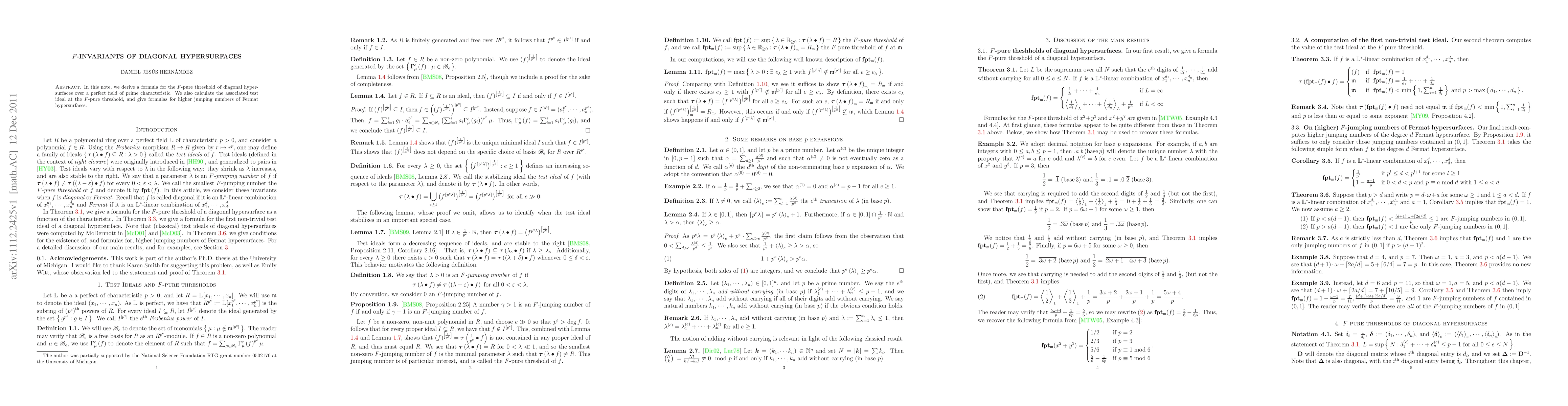 Summary: This paper derives a formula for the F-pure threshold of diagonal hypersurfaces in positive characteristic, computes the associated test ideal, and provides formulas for higher jumping numbers of Fermat hypersurfaces. The results are significant for understanding F-singularities in algebraic geometry.