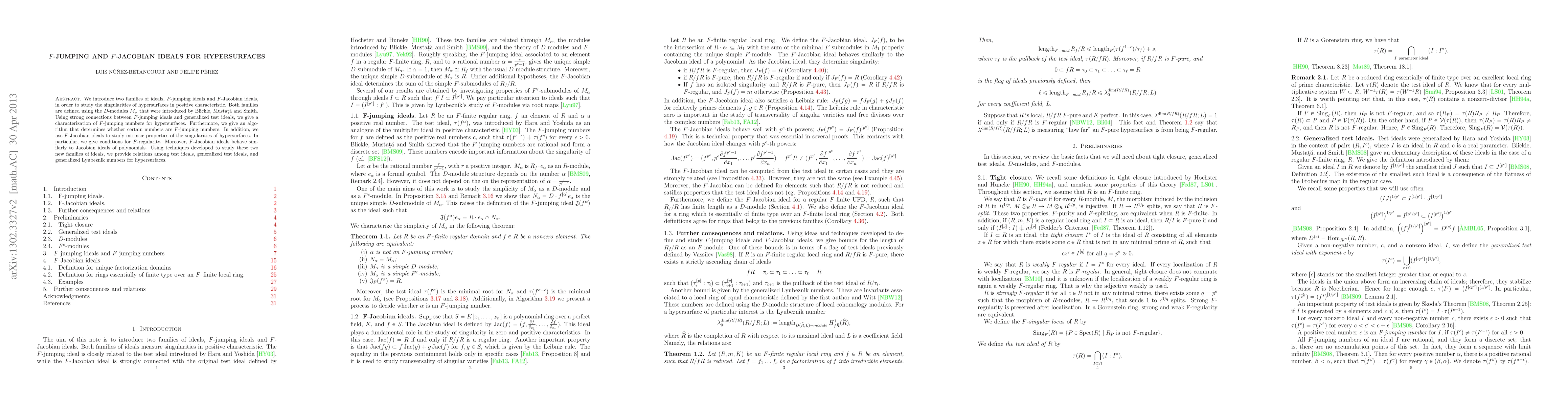 We introduce two families of ideals, $F$-jumping ideals and $F$-Jacobian ideals, in order to study the singularities of hypersurfaces in positive characteristic. Both families are defined using the $D$-modules $M_{\alpha}$ that were introduced by Blickle, Musta\c{t}\u{a} and Smith. Using strong connections between $F$-jumping ideals and generalized test ideals, we give a characterization of $F$-jumping numbers for hypersurfaces. Furthermore, we give an algorithm that determines whether certain numbers are $F$-jumping numbers. In addition, we use $F$-Jacobian ideals to study intrinsic properties of the singularities of hypersurfaces. In particular, we give conditions for $F$-regularity. Moreover, $F$-Jacobian ideals behave similarly to Jacobian ideals of polynomials. Using techniques developed to study these two new families of ideals, we provide relations among test ideals, generalized test ideals, and generalized Lyubeznik numbers for hypersurfaces.