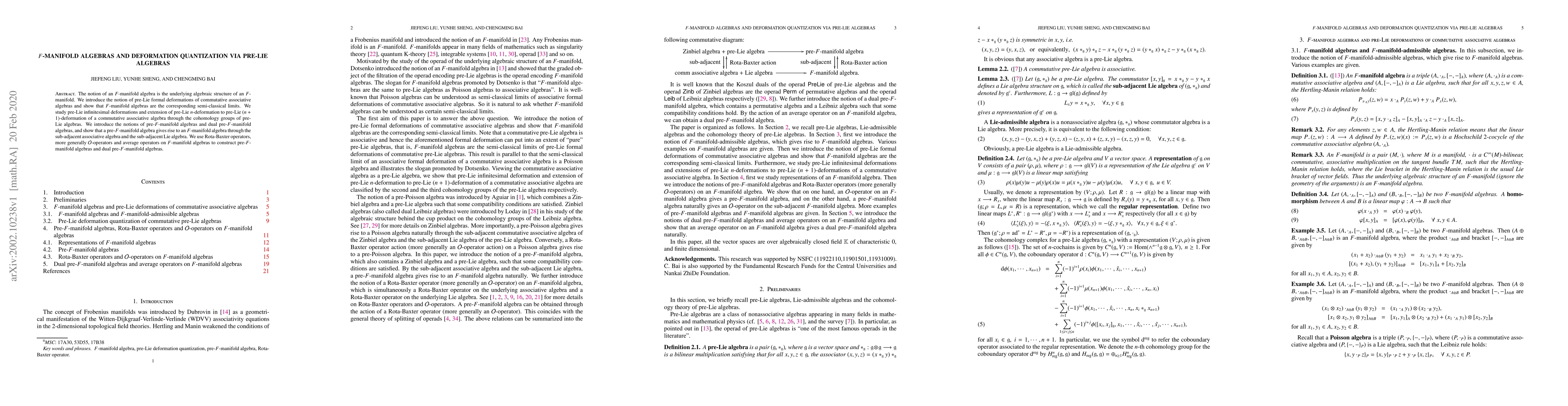 This paper introduces F-manifold algebras as the algebraic structure underlying $F$-manifolds, linking them to pre-Lie algebras for deformation quantization. It explores pre-Lie infinitesimal deformations and constructs pre-F-manifold algebras using Rota-Baxter operators, showing how they semi-classically limit to F-manifold algebras.
