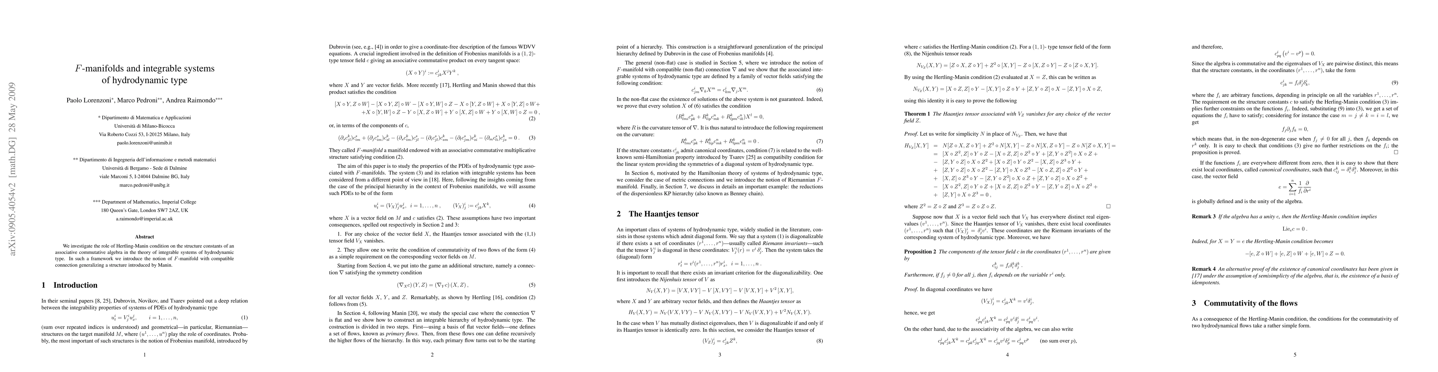 This paper explores the Hertling-Manin condition's impact on the structure constants of associative commutative algebras within integrable systems of hydrodynamic type. It introduces F-manifolds with compatible connections, generalizing Manin's original structure.