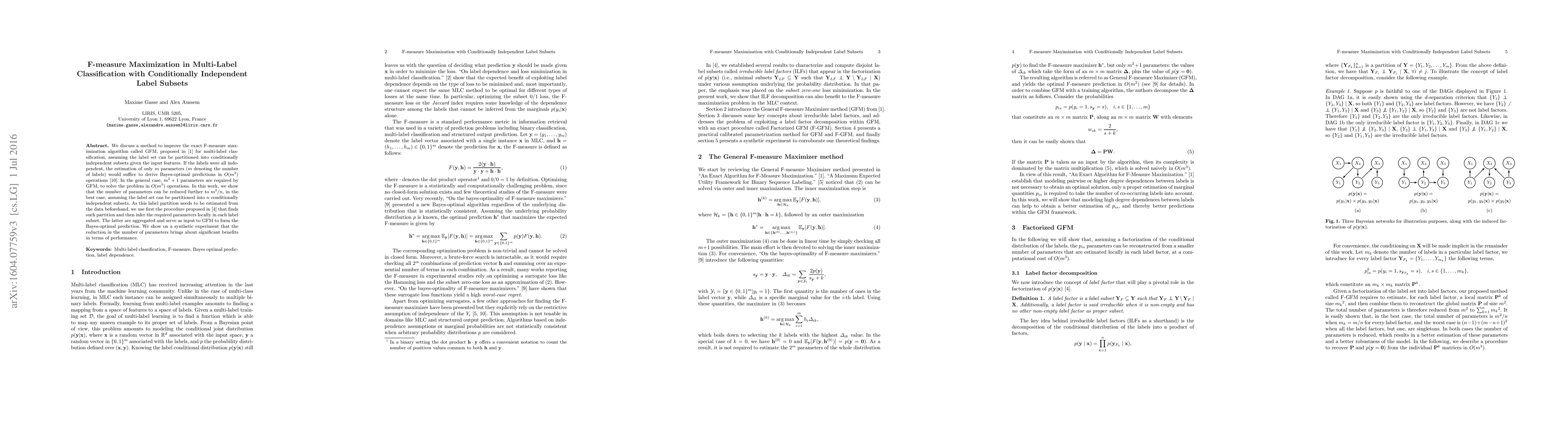 We discuss a method to improve the exact F-measure maximization algorithm called GFM, proposed in (Dembczynski et al. 2011) for multi-label classification, assuming the label set can be can partitioned into conditionally independent subsets given the input features. If the labels were all independent, the estimation of only $m$ parameters ($m$ denoting the number of labels) would suffice to derive Bayes-optimal predictions in $O(m^2)$ operations. In the general case, $m^2+1$ parameters are required by GFM, to solve the problem in $O(m^3)$ operations. In this work, we show that the number of parameters can be reduced further to $m^2/n$, in the best case, assuming the label set can be partitioned into $n$ conditionally independent subsets. As this label partition needs to be estimated from the data beforehand, we use first the procedure proposed in (Gasse et al. 2015) that finds such partition and then infer the required parameters locally in each label subset. The latter are aggregated and serve as input to GFM to form the Bayes-optimal prediction. We show on a synthetic experiment that the reduction in the number of parameters brings about significant benefits in terms of performance.