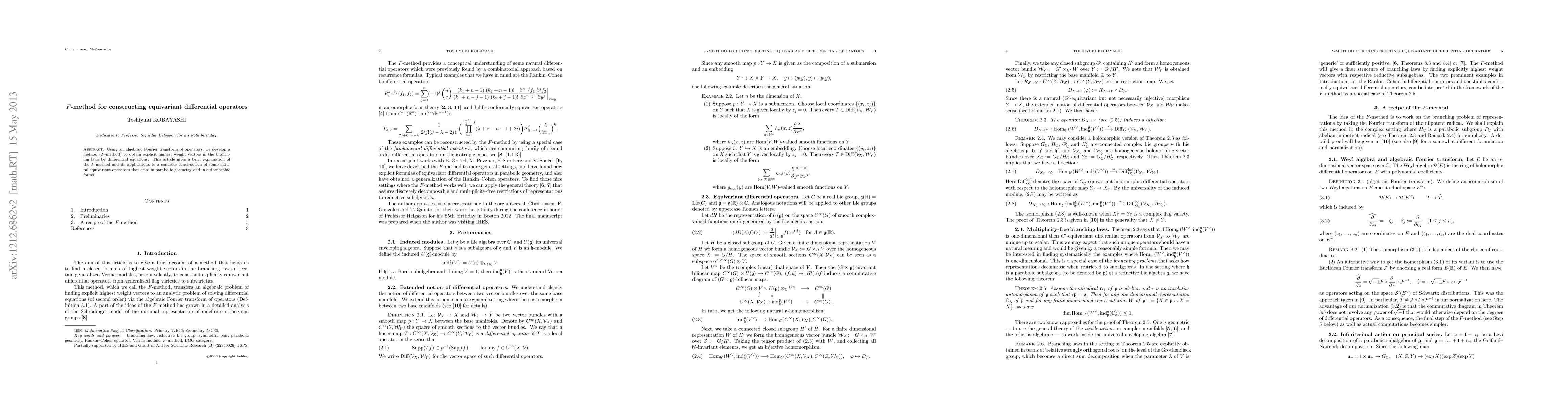 Using an algebraic Fourier transform of operators, we develop a method (F-method) to obtain explicit highest weight vectors in the branching laws by differential equations. This article gives a brief explanation of the F-method and its applications to a concrete construction of some natural equivariant operators that arise in parabolic geometry and in automorphic forms.