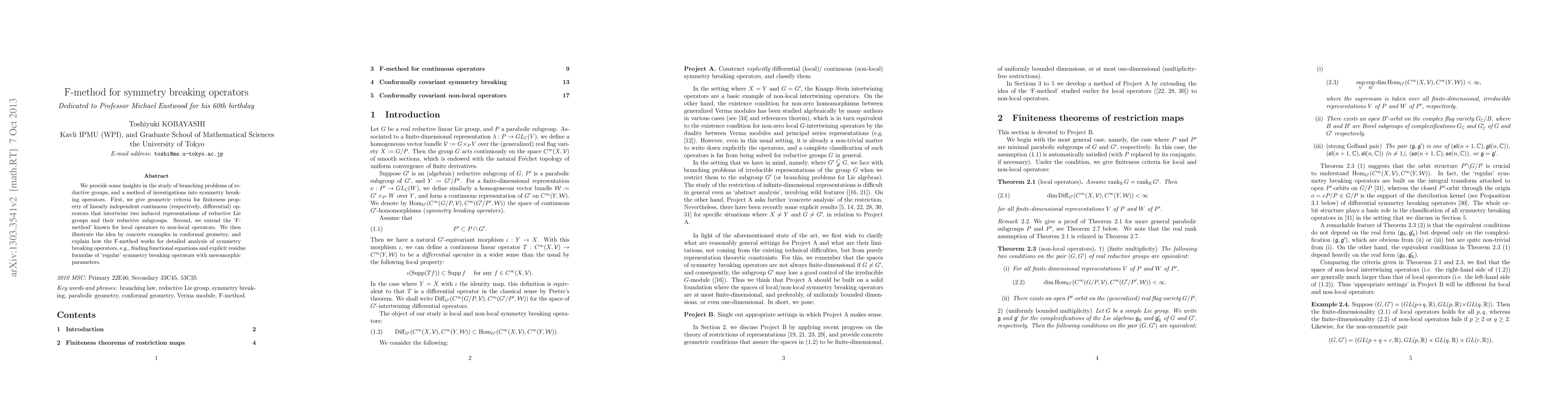 This paper introduces the F-method for analyzing symmetry breaking operators in reductive groups, providing geometric criteria for finiteness of intertwining operators and extending the method to non-local operators. It demonstrates the method's application in conformal geometry to derive functional equations and residue formulae for symmetry breaking operators.