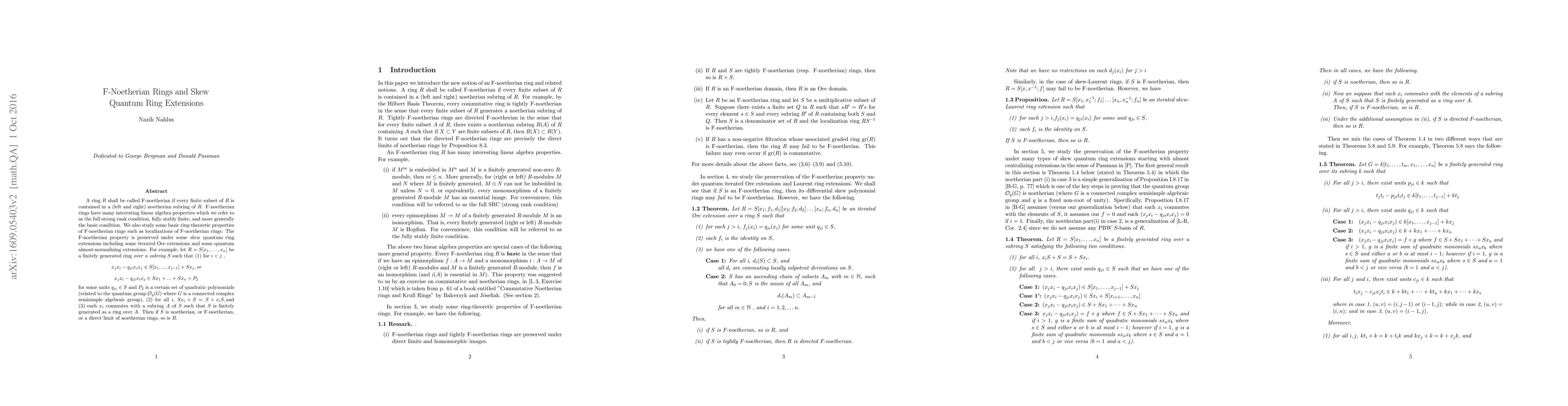 A ring R shall be called F-noetherian if every finite subset of R is contained in a (left and right) noetherian subring of R . For example, every commutative ring is tightly F-noetherian in the sense that every finite subset of R generates a noetherian subring of R . F-noetherian rings have many interesting linear algebra properties which we refer to as the full strong rank condition, fully stably finite, and more generally the basic condition. We also study some basic ring-theoretic properties of F-noetherian rings such as localizations of F-noetherian rings. The F-noetherian property is preserved under some \emph{skew} quantum ring extensions including some iterated Ore extensions, some skew-Laurent extensions, and some quantum almost-normalizing extensions. For example, let R= S[ x_1, ..., x_n ] be a finitely generated ring \textit {over a subring S} such that (1) for i < j, \[ x_j x_i -q_{ji} x_i x_j \in S [ x_1, ..., x_{j-1}] + Sx_j \] for some units q_{ji} \in S, (2) for all i, Sx_i +S= S+ x_i S, and (3) each x_i commutes with a subring A of S such that S is finitely generated as a ring over A . Then, if S is F-noetherian, so is R . We also discuss some skew quadratic extensions related to the quantum group \mathcal{O}_q(G) where G is a connected complex semisimple algebraic group. Finally, we show many examples and some generalizations of some quantum groups like \mathcal{O}_q(M_n(k)) over an F-noetherian ring k where each variable x_{ij} \textit{may not commute} with the elements of k .