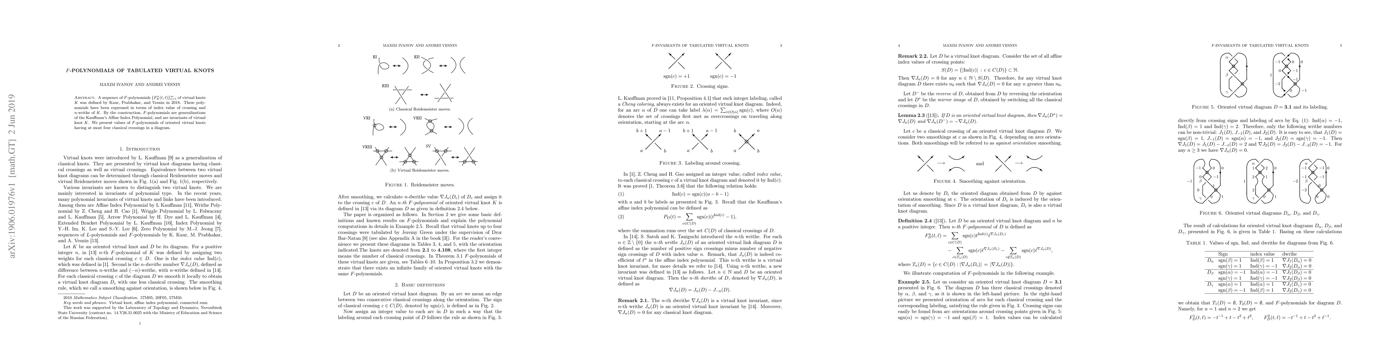 This paper defines $F$-polynomials for virtual knots, generalizing Kauffman's Affine Index Polynomial, and provides their values for oriented virtual knots with up to four classical crossings. These polynomials are invariants of virtual knots and are expressed in terms of crossing indices and $n$-writhe.