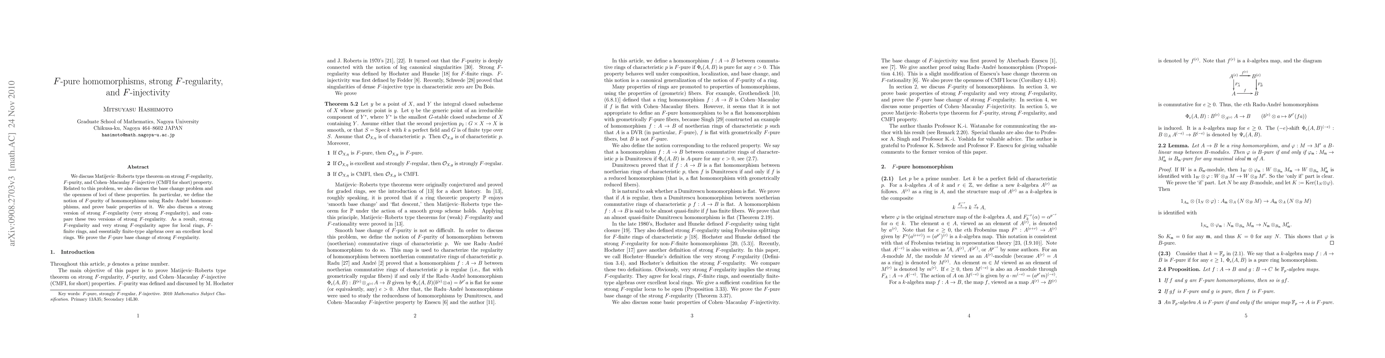 This paper explores the properties of $F$-pure homomorphisms, strong $F$-regularity, and Cohen-Macaulay $F$-injectivity, proving the base change and openness of these properties. It introduces the notion of $F$-purity of homomorphisms and establishes its basic properties, comparing strong and very strong $F$-regularity and showing they coincide for specific types of rings.