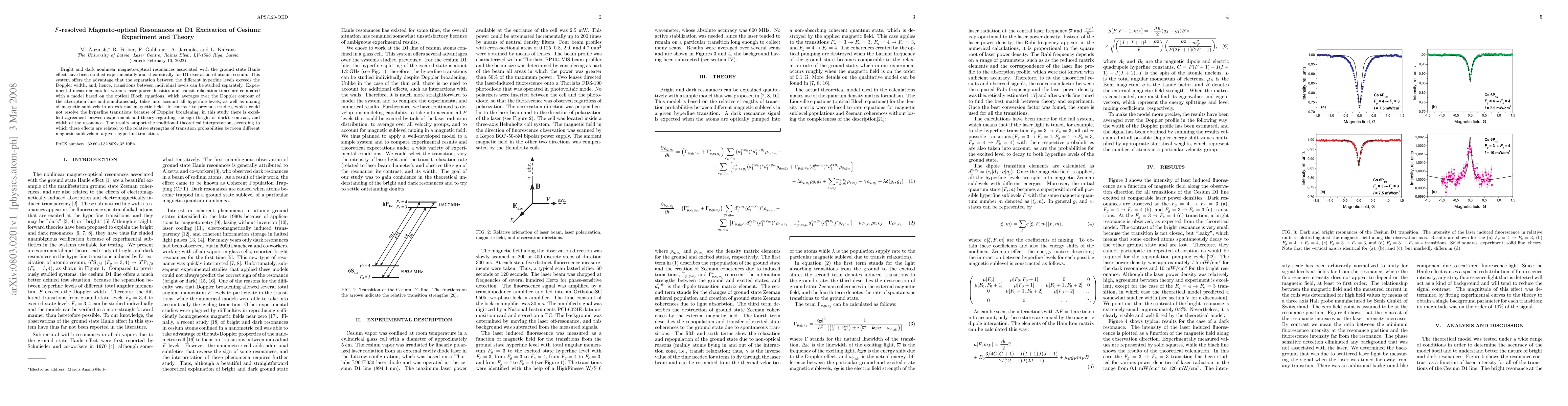 This paper investigates bright and dark magneto-optical resonances in cesium's D1 excitation, resolving hyperfine transitions separately due to the system's separation exceeding the Doppler width. Experimental results align well with theoretical models based on optical Bloch equations, providing insights into transition probabilities between magnetic sublevels.