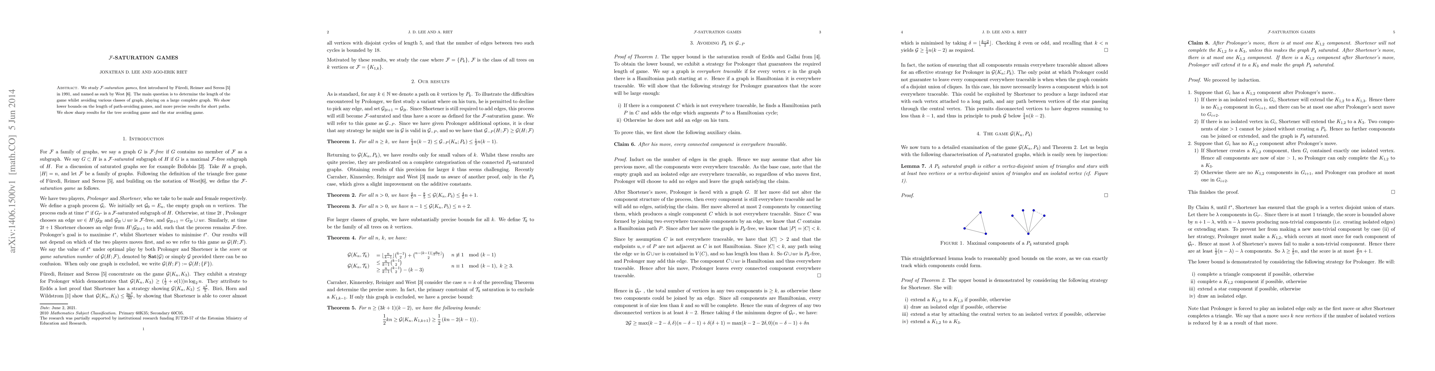 The paper presents detailed proofs and strategies for F-saturation games, particularly for path, tree, and star avoidance, providing both lower and upper bounds for game lengths.