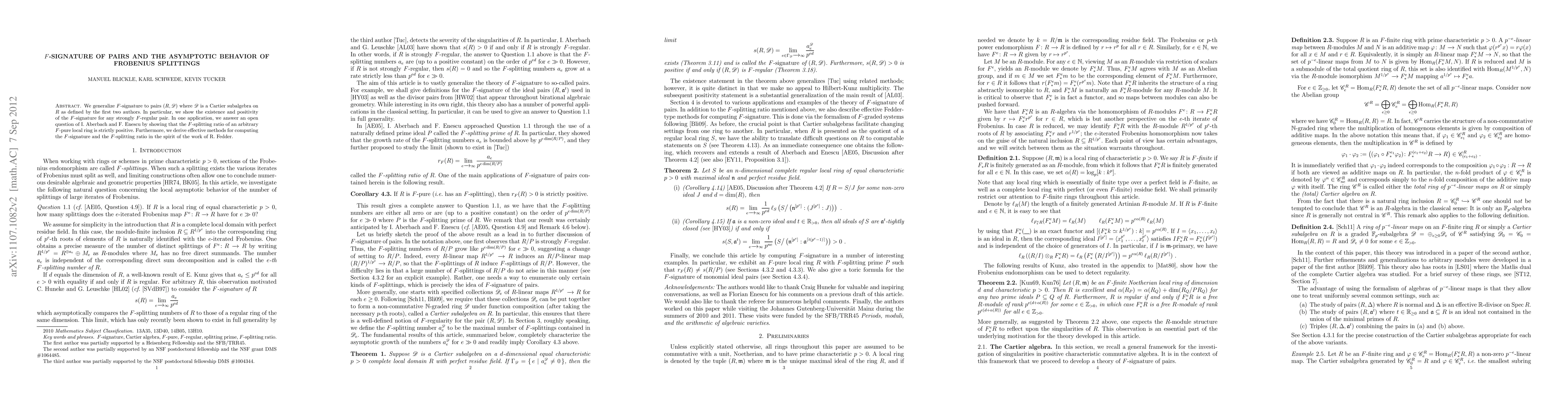 We generalize $F$-signature to pairs $(R,D)$ where $D$ is a Cartier subalgebra on $R$ as defined by the first two authors. In particular, we show the existence and positivity of the $F$-signature for any strongly $F$-regular pair. In one application, we answer an open question of I. Aberbach and F. Enescu by showing that the $F$-splitting ratio of an arbitrary $F$-pure local ring is strictly positive. Furthermore, we derive effective methods for computing the $F$-signature and the $F$-splitting ratio in the spirit of the work of R. Fedder.