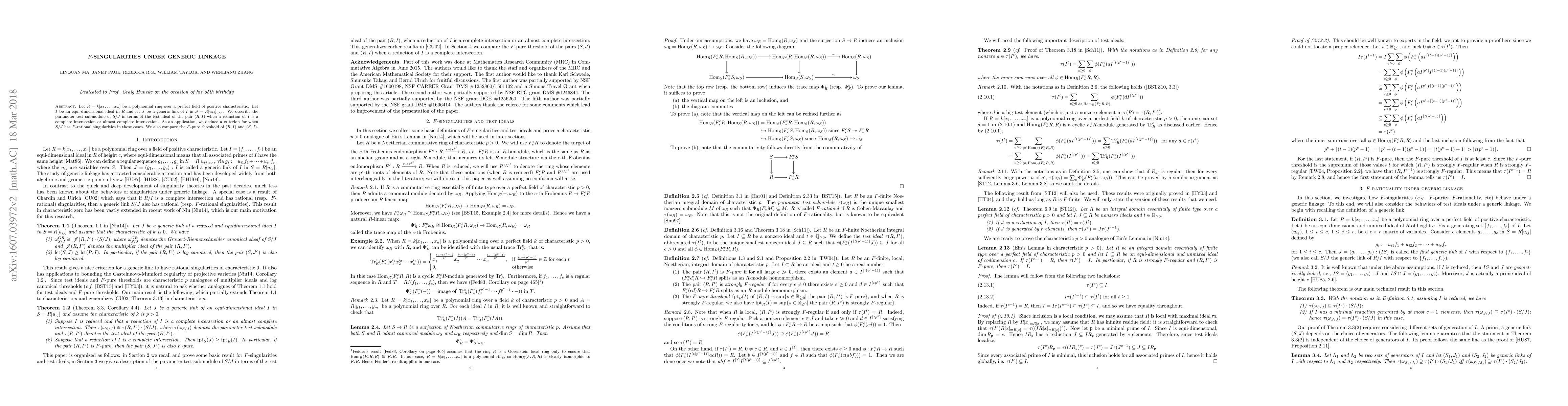 Let $R=k[x_1,\dots,x_n]$ be a polynomial ring over a prefect field of positive characteristic. Let $I$ be an unmixed ideal in $R$ and let $J$ be a generic link of $I$ in $S=R[u_{ij}]_{c \times r}$. We describe the parameter test submodule of $S/J$ in terms of the test ideal of the pair $(R, I)$ when a reduction of $I$ is a complete intersection or almost complete intersection. As an application, we deduce a criterion for when $S/J$ has $F$-rational singularities in these cases. We also compare the $F$-pure threshold of $(R, I)$ and $(S, J)$.