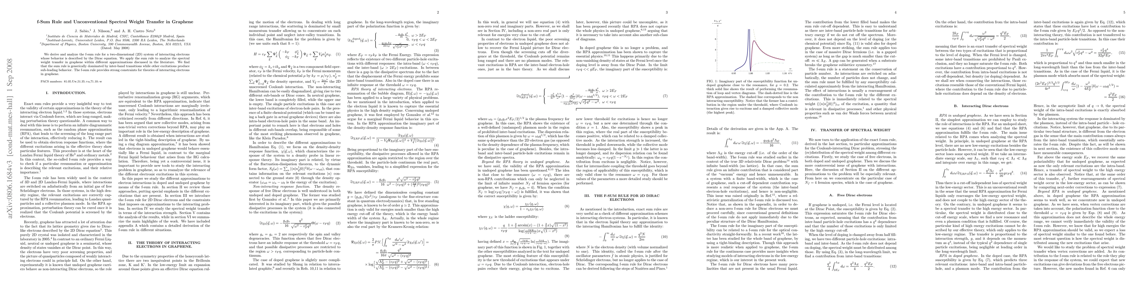 The paper derives and analyzes the f-sum rule for interacting electrons in graphene, revealing that inter-band transitions dominate spectral weight transfer, while other excitations contribute less. This sum rule imposes significant constraints on theories of electron interactions in graphene.