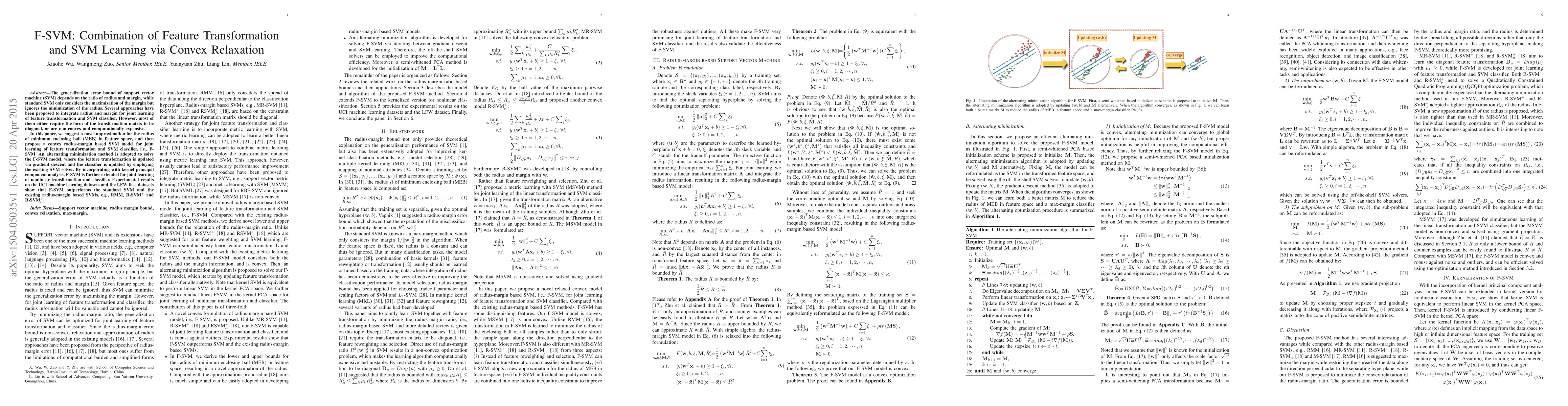 The paper proposes F-SVM, a convex radius-margin based SVM model that jointly learns feature transformation and classifier, outperforming standard SVM and existing radius-margin methods. The F-SVM model uses an alternating minimization method for optimization and extends to nonlinear transformations via kernel principal component analysis.