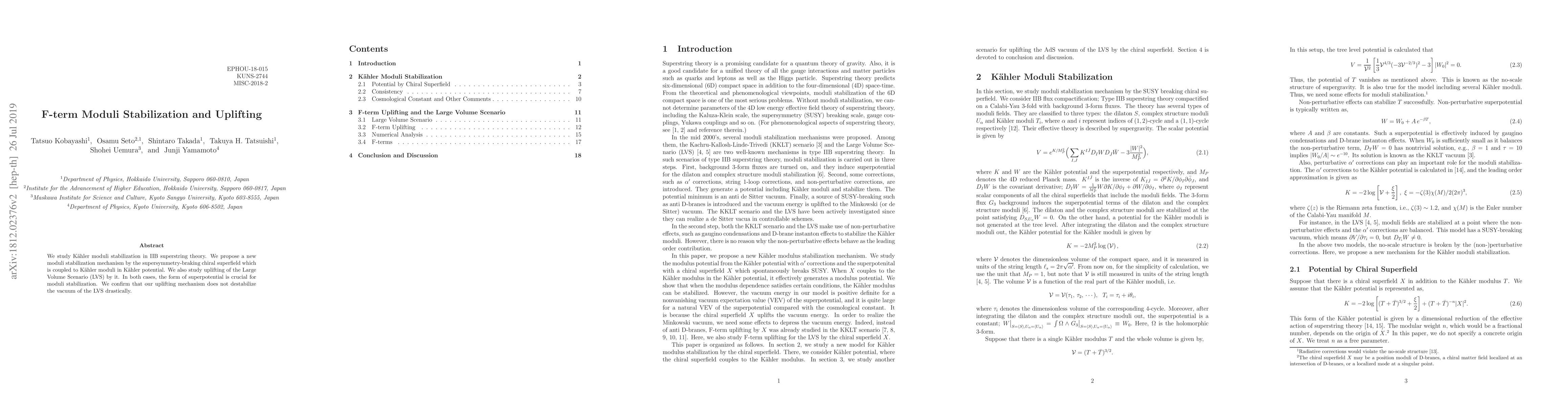 The research investigates Kähler moduli stabilization in IIB superstring theory, proposing a new stabilization mechanism via a supersymmetry-breaking chiral superfield coupled to Kähler moduli in the Kähler potential. The study also examines uplifting of the Large Volume Scenario (LVS) by this mechanism.