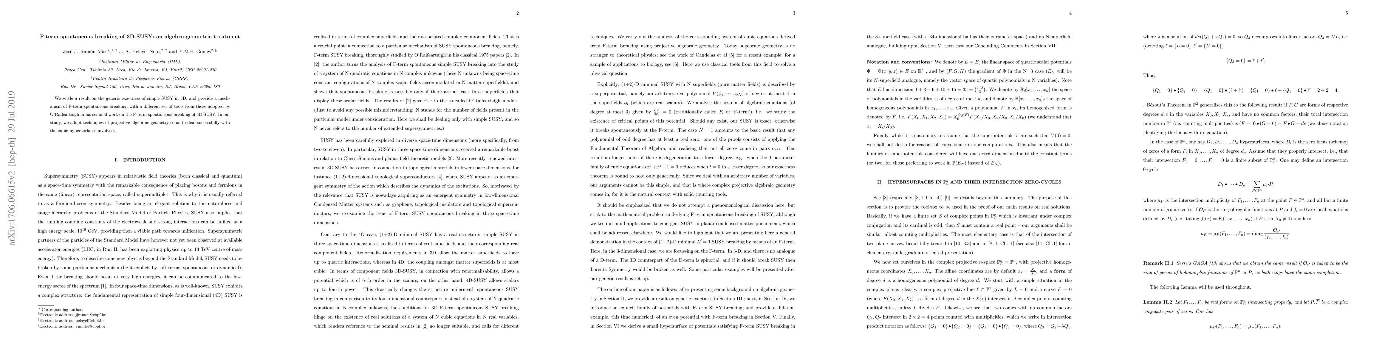 We settle a result on generic exactness of SUSY in 3-D, and provide a mechanism of F-term spontaneous breaking of 3-D SUSY, with a different set of tools from those used by O'Raifeartaigh in his seminal work on 4-D SUSY. In our study, we use techniques of projective algebraic geometry so as to deal successfully with cubic hypersurfaces.