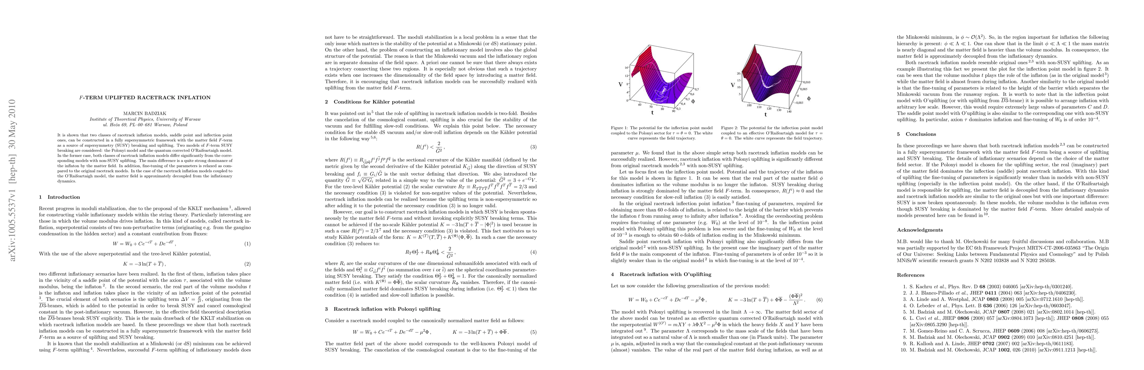 This paper constructs supersymmetric racetrack inflation models where F-term supersymmetry breaking uplifts the minimum. It finds that the Polony model significantly alters the inflaton dominance and reduces parameter fine-tuning, while the O'Raifeartaigh model decouples the matter field from inflation dynamics.