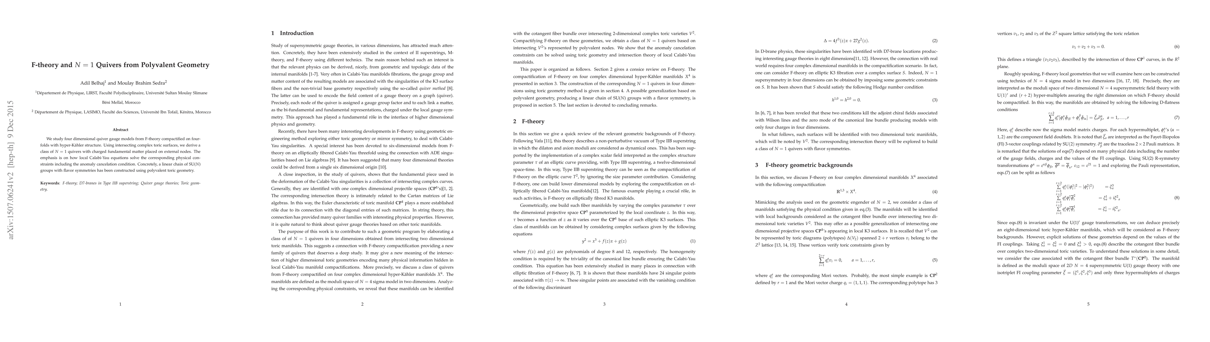 This paper explores four-dimensional quiver gauge models derived from F-theory on hyper-Kähler fourfolds, focusing on the construction of N=1 quivers using intersecting complex toric surfaces. It highlights how local Calabi-Yau equations enforce physical constraints, including anomaly cancellation, in a linear chain of SU(N) groups with flavor symmetries based on polyvalent toric geometry.
