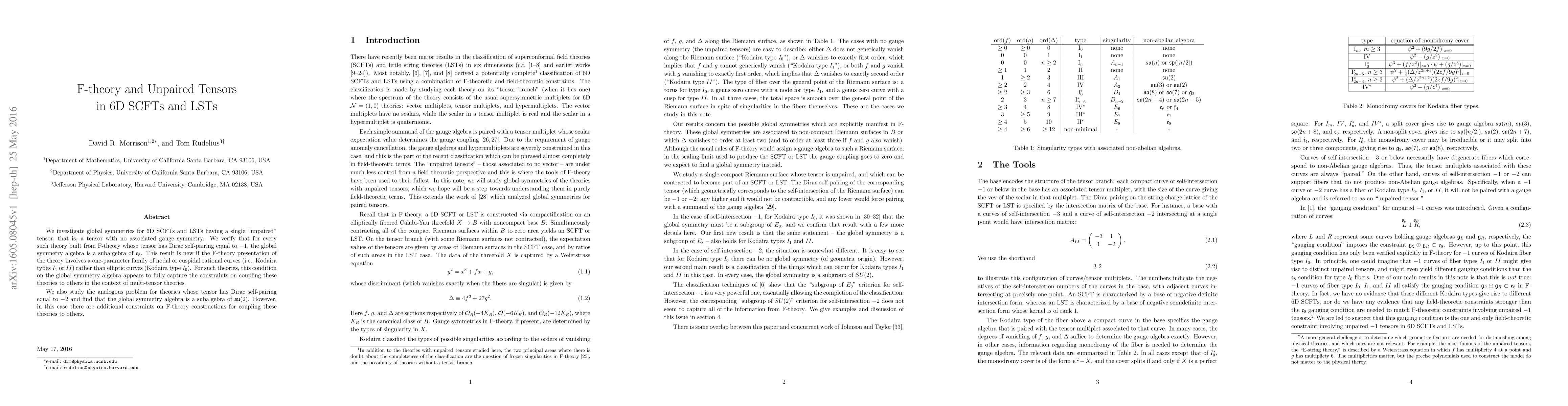We investigate global symmetries for 6D SCFTs and LSTs having a single "unpaired" tensor, that is, a tensor with no associated gauge symmetry. We verify that for every such theory built from F-theory whose tensor has Dirac self-pairing equal to -1, the global symmetry algebra is a subalgebra of $\mathfrak{e}_8$. This result is new if the F-theory presentation of the theory involves a one-parameter family of nodal or cuspidal rational curves (i.e., Kodaira types $I_1$ or $II$) rather than elliptic curves (Kodaira type $I_0$). For such theories, this condition on the global symmetry algebra appears to fully capture the constraints on coupling these theories to others in the context of multi-tensor theories. We also study the analogous problem for theories whose tensor has Dirac self-pairing equal to -2 and find that the global symmetry algebra is a subalgebra of $\mathfrak{su}(2)$. However, in this case there are additional constraints on F-theory constructions for coupling these theories to others.