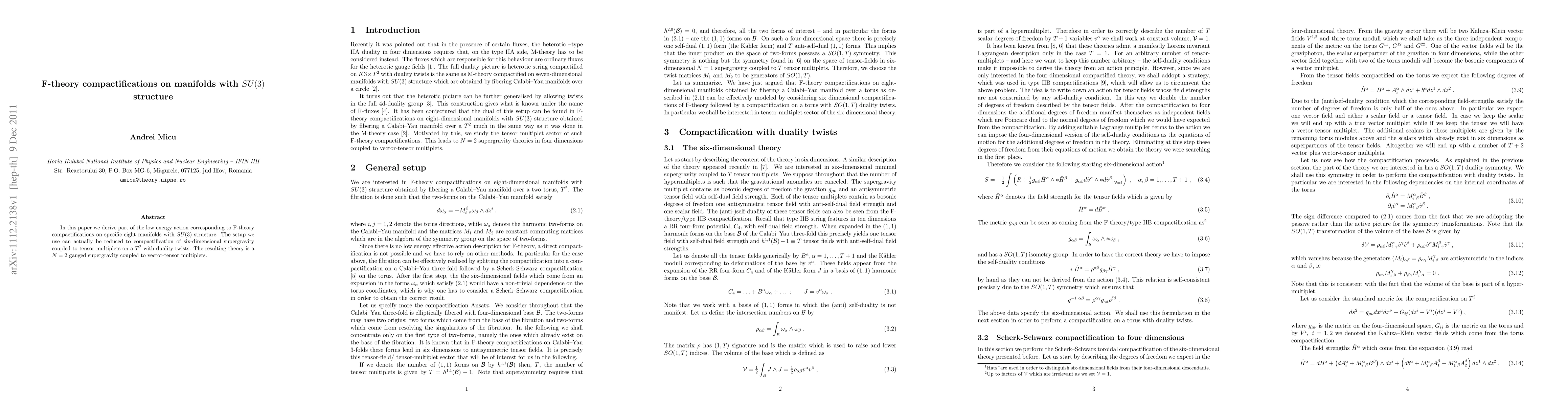 In this paper we derive part of the low energy action corresponding to F-theory compactifications on specific eight manifolds with SU(3) structure. The setup we use can actually be reduced to compactification of six-dimensional supergravity coupled to tensor multiplets on a T^2 with duality twists. The resulting theory is a N=2 gauged supergravity coupled to vector-tensor multiplets.