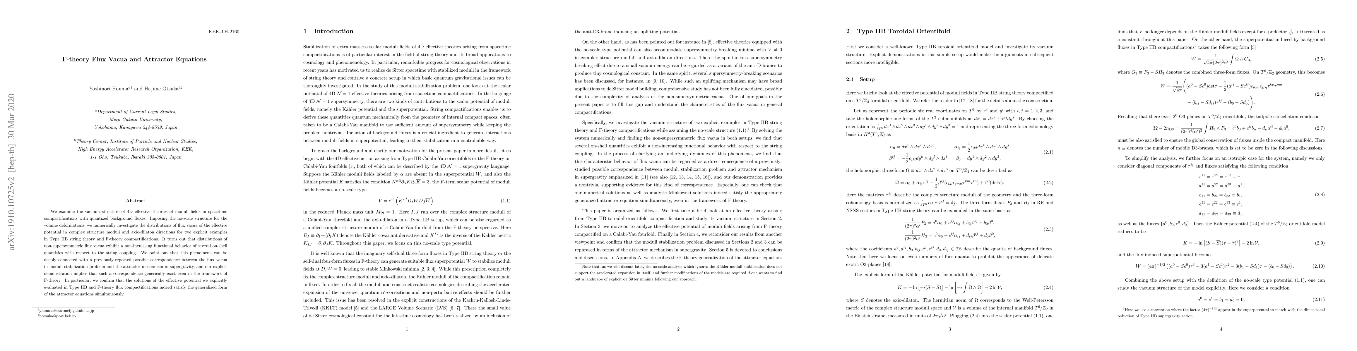 We examine the vacuum structure of 4D effective theories of moduli fields in spacetime compactifications with quantized background fluxes. Imposing the no-scale structure for the volume deformations, we numerically investigate the distributions of flux vacua of the effective potential in complex structure moduli and axio-dilaton directions for two explicit examples in Type IIB string theory and F-theory compactifications. It turns out that distributions of non-supersymmetric flux vacua exhibit a non-increasing functional behavior of several on-shell quantities with respect to the string coupling. We point out that this phenomena can be deeply connected with a previously-reported possible correspondence between the flux vacua in moduli stabilization problem and the attractor mechanism in supergravity, and our explicit demonstration implies that such a correspondence generically exist even in the framework of F-theory. In particular, we confirm that the solutions of the effective potential we explicitly evaluated in Type IIB and F-theory flux compactifications indeed satisfy the generalized form of the attractor equations simultaneously.