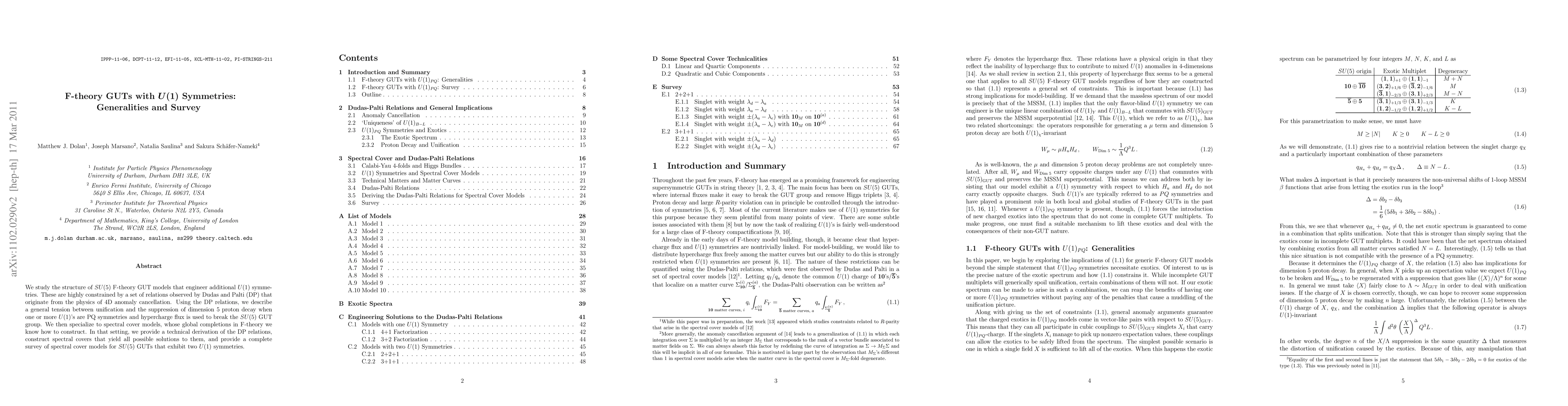 We study the structure of SU(5) F-theory GUT models that engineer additional U(1) symmetries. These are highly constrained by a set of relations observed by Dudas and Palti (DP) that originate from the physics of 4D anomaly cancellation. Using the DP relations, we find a general tension between unification and the suppression of dimension 5 proton decay when one or more U(1)'s are PQ symmetries and hypercharge flux is used to break the SU(5) GUT group. We then specialize to spectral cover models, whose global completions in F- theory we know how to construct. In that setting, we provide a technical derivation of the DP relations, construct spectral covers that yield all possible solutions to them, and provide a complete survey of spectral cover models for SU(5) GUTs that exhibit two U(1) symmetries.